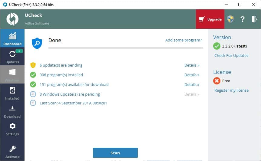 Développé par Adlice Software, UCheck est un logiciel freemium : gratuit, mais avec des fonctionnalités supplémentaires si vous avez la licence. Son fonctionnement s’avère très simple puisque l’on actualise l’ensemble de ses applications en 2 clics :