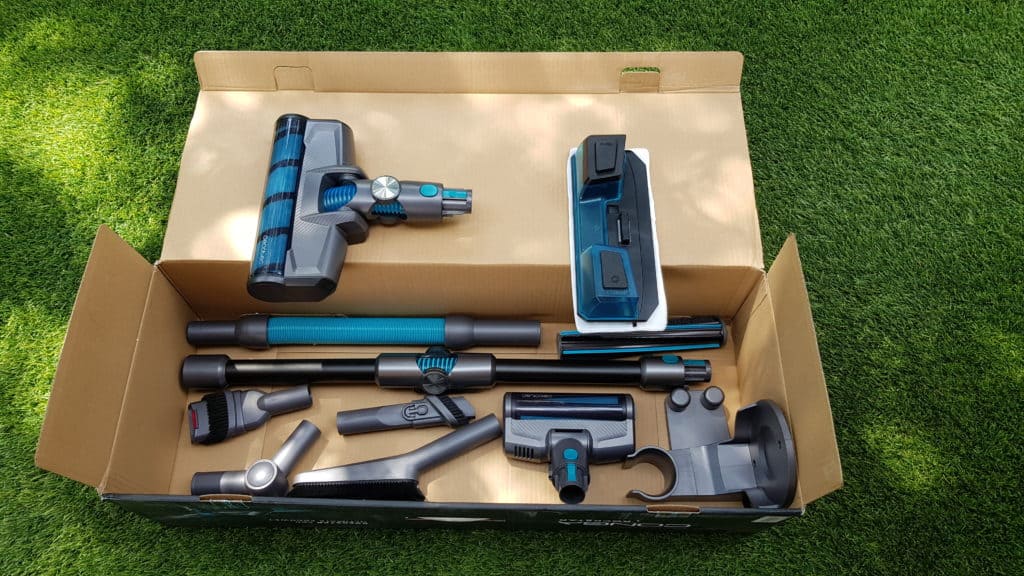 Premièrement, j’ouvre mon colis, tout est rangé au millimètre près et emballé dans des sachets plastiques. Je découvre en déballant, comme un enfant qui ouvre son cadeau, un aspirateur compact avec de multiples accessoires qui me font tourner la tête à 360°.