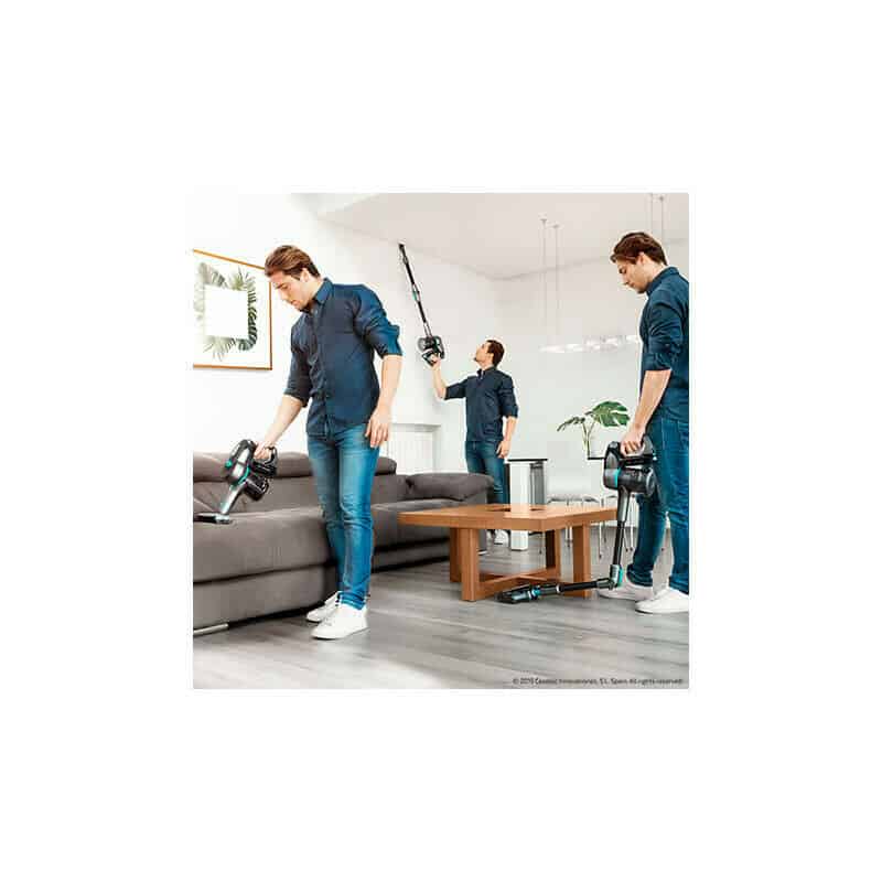 Avant de passer à l’analyse des performances, je vais vous faire l’inventaire de sa technologie. En effet, cet aspirateur sans fil 4 en 1 est multifonctions. Il s’utilise de façon verticale, en balai, à main et en nettoie-sol pour différentes surfaces qui permet d’éliminer tout type de saletés de n’importe quel endroit (carrelage, parquet, moquette, tapis, canapé, meubles, jouets, objets…).