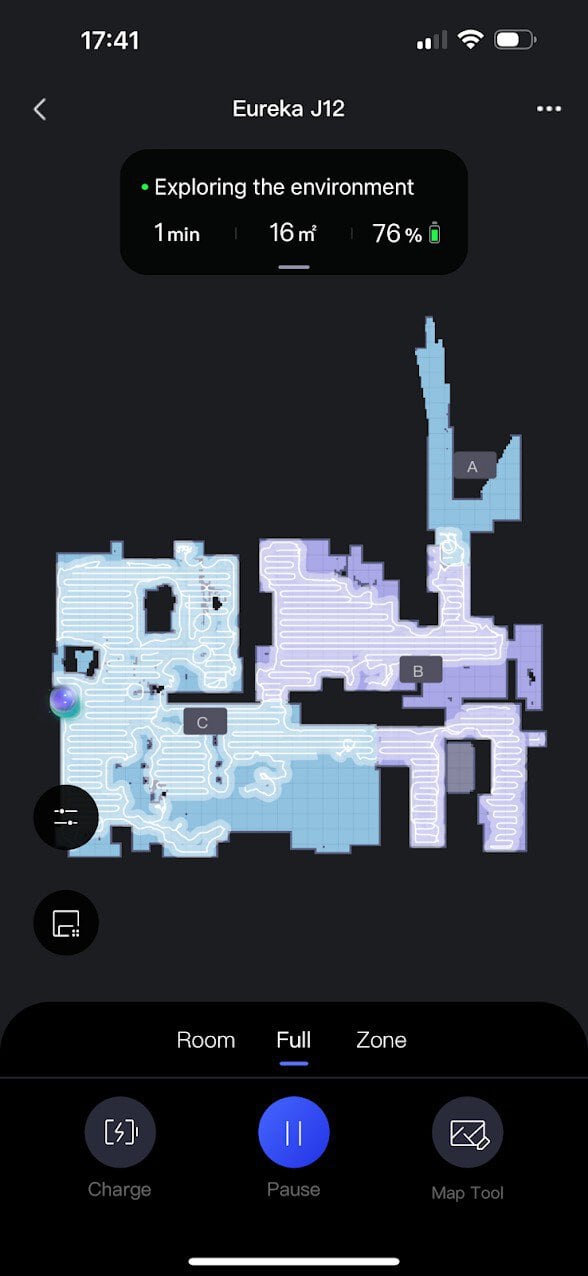 Pour mon test pratique, voilà deux semaines que j’utilise le robot aspirateur Eureka J12 Ultra à la maison dans mon rez-de-chaussée de 100 m2 : les résultats sont bons, voire excellents et semblables à ce que j’ai habituellement avec le Dreame L20S Ultra ! L’aspirateur fonctionne parfait et ne fait pas tant de bruit que ça avec sa puissance de 5000Pa : il laisse à peine quelques miettes derrière lui et je trouve que le système de tracé très pertinent : j’ai moins le sentiment que le robot utilise un itinéraire illogique qu’avec la concurrence.