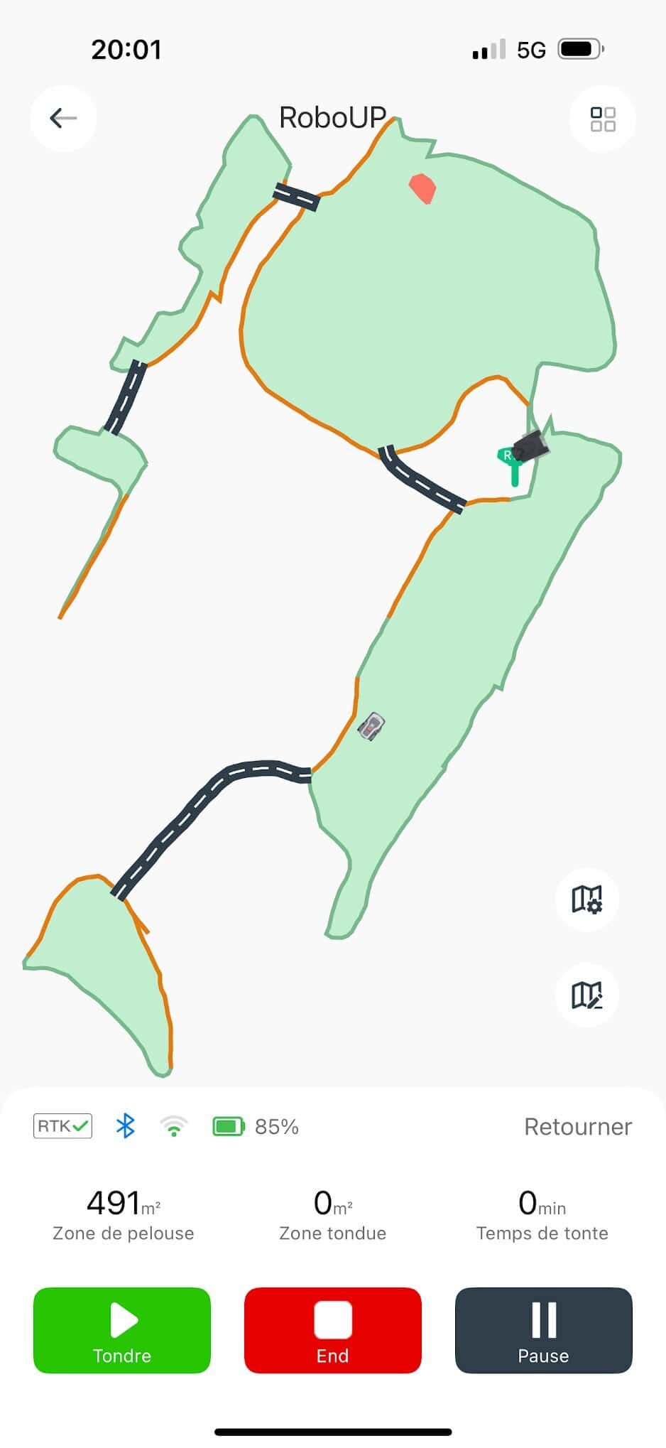Paramétrage & installation : très facile. L’antenne RTK aide beaucoup dès le départ. On lui fait faire le tour du jardin en mode voiture téléguidée. Il reconnait alors le parcours sans aucun mal : bien plus simple qu’avec un robot à câble.