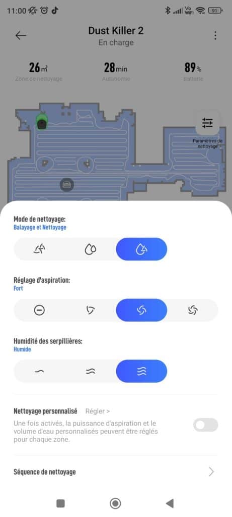 La prise en mains de ce Dreame L10S Pro est un jeu d’enfants en suivant les instructions fournies dans la boite. On branche l’aspirateur, on installe l’application Xiaomi Home et puis on suit les instructions afin d’ajouter l’aspirateur au réseau d’appareils Xiaomi. Une fois chargé, on peut lancer l’aspirateur pour un premier tour d’observation où il fera bien entendu l’état des lieux pour comprendre son environnement. Au niveau des modes, on a le choix entre 4 puissances d’aspiration et 3 modes de nettoyage à l’eau. Pour ma part, j’ai opté pour le mode aspiration forte et nettoyage humide. L’aspirateur est vraiment silencieux et s’acquitte de sa tâche en 25 min environ pour une trentaine de mètres carré.