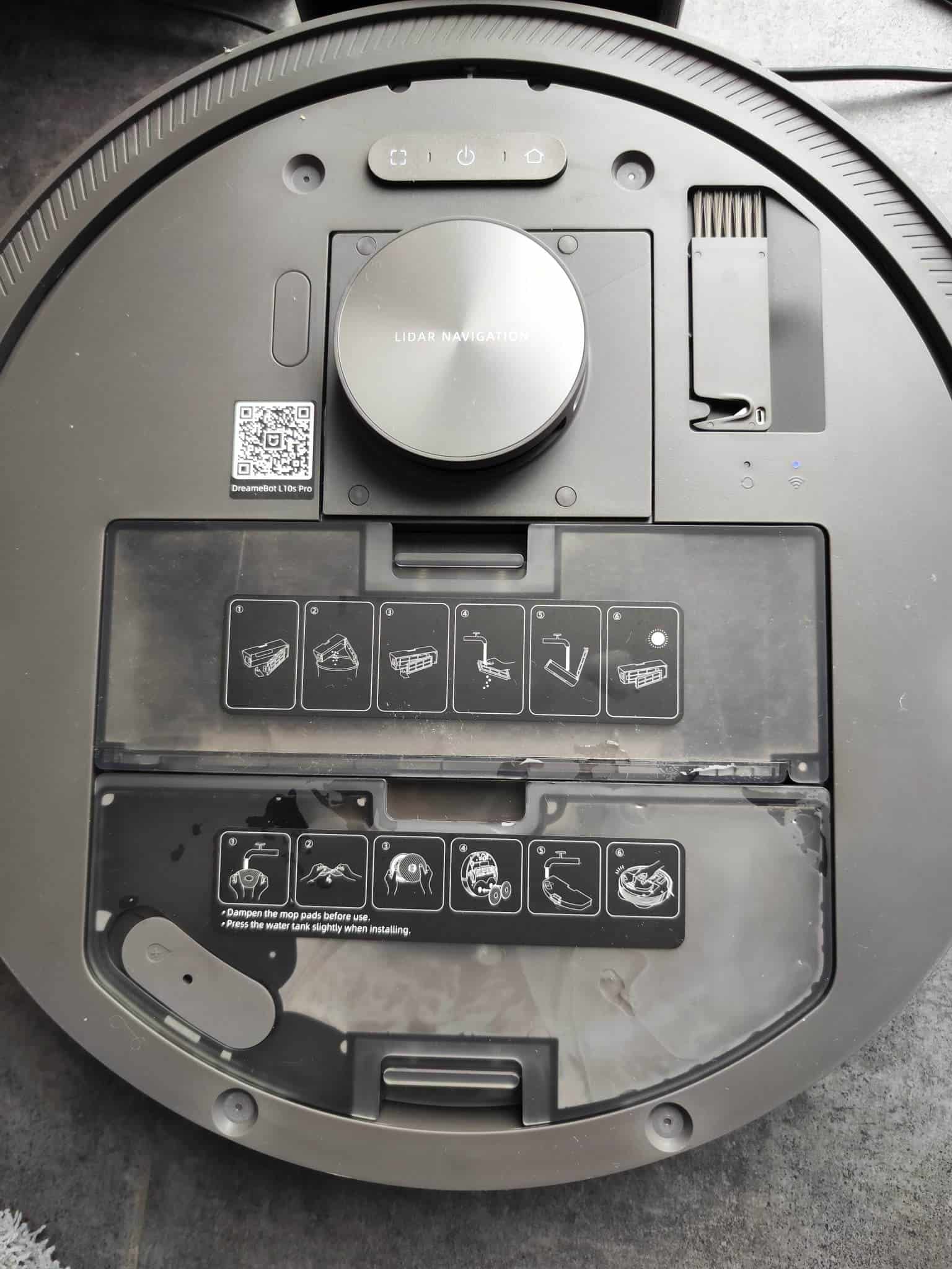 Au niveau technique, le Dreame L10S Pro offre une puissance d’aspiration de 5300 Pa (contre 4000 au Z10 Pro), ce qui me parait amplement suffisant pour mes besoins. Les réservoirs (amovibles) de poussière et d’eau ont des capacités respectives de 450 ml et 190 ml. On retrouve ces derniers sous le capot amovible de l’aspirateur sous lequel on retrouvera également une petite brosse/coupe poils bien rangée. Bien vu car si cet accessoire peut s’avérer pratique, le fait de ne pas l’utiliser tous les jours fait qu’on peut facilement le perdre.