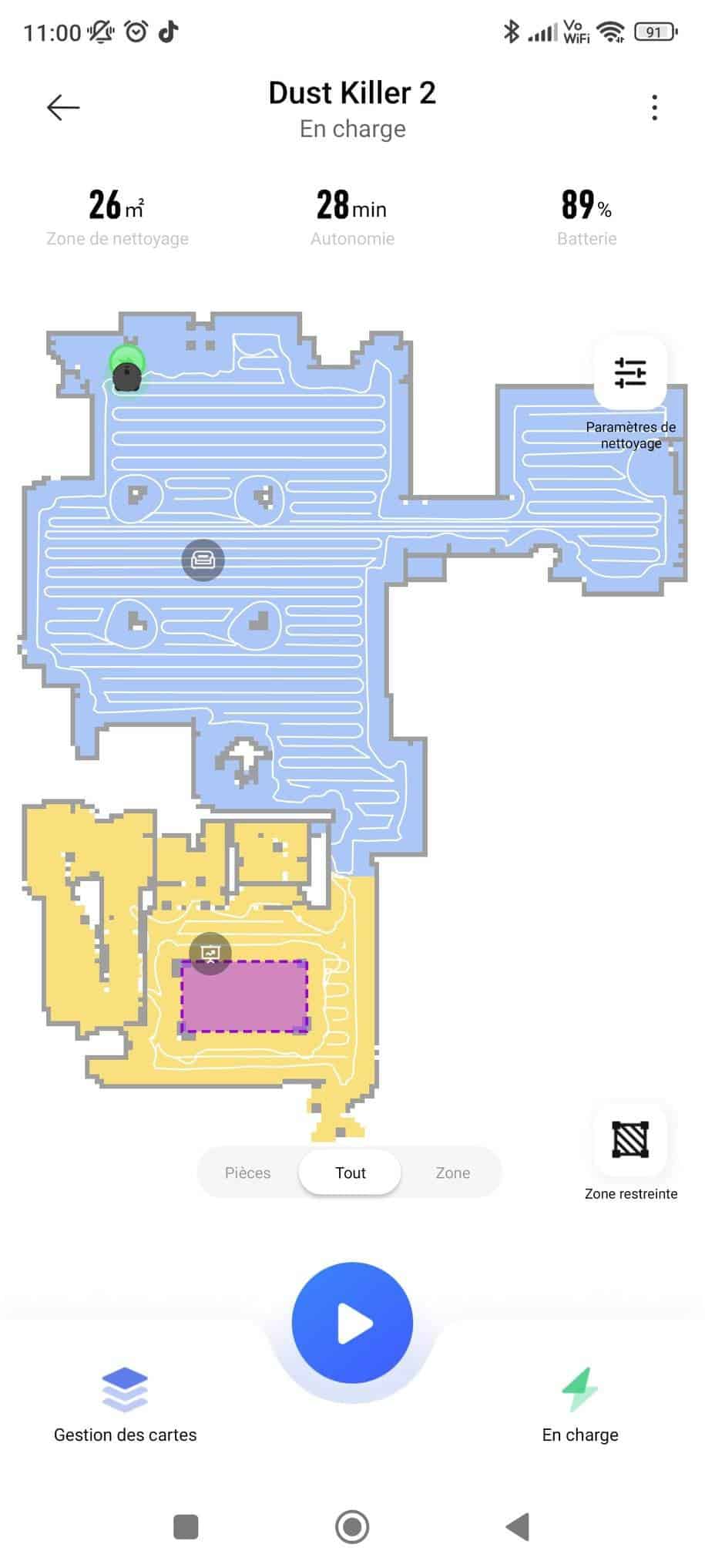 Via l’app, il sera bien sûr possible de programmer l’heure de passage de l’aspirateur mais aussi de gérer vos cartes afin de définir des zones où il doit nettoyer plus en profondeur voire ne pas passer du tout. J’évite, par exemple, de le faire passer sur mon tapis lorsque je lui demande de nettoyer à l’eau. Même si, celui-ci dispose de l’option permettant de relever les brosses de 7 mm lors du passage sur tapis. Pas mal mais pas suffisant si votre tapis est gros ou a des poils longs comme le mien.