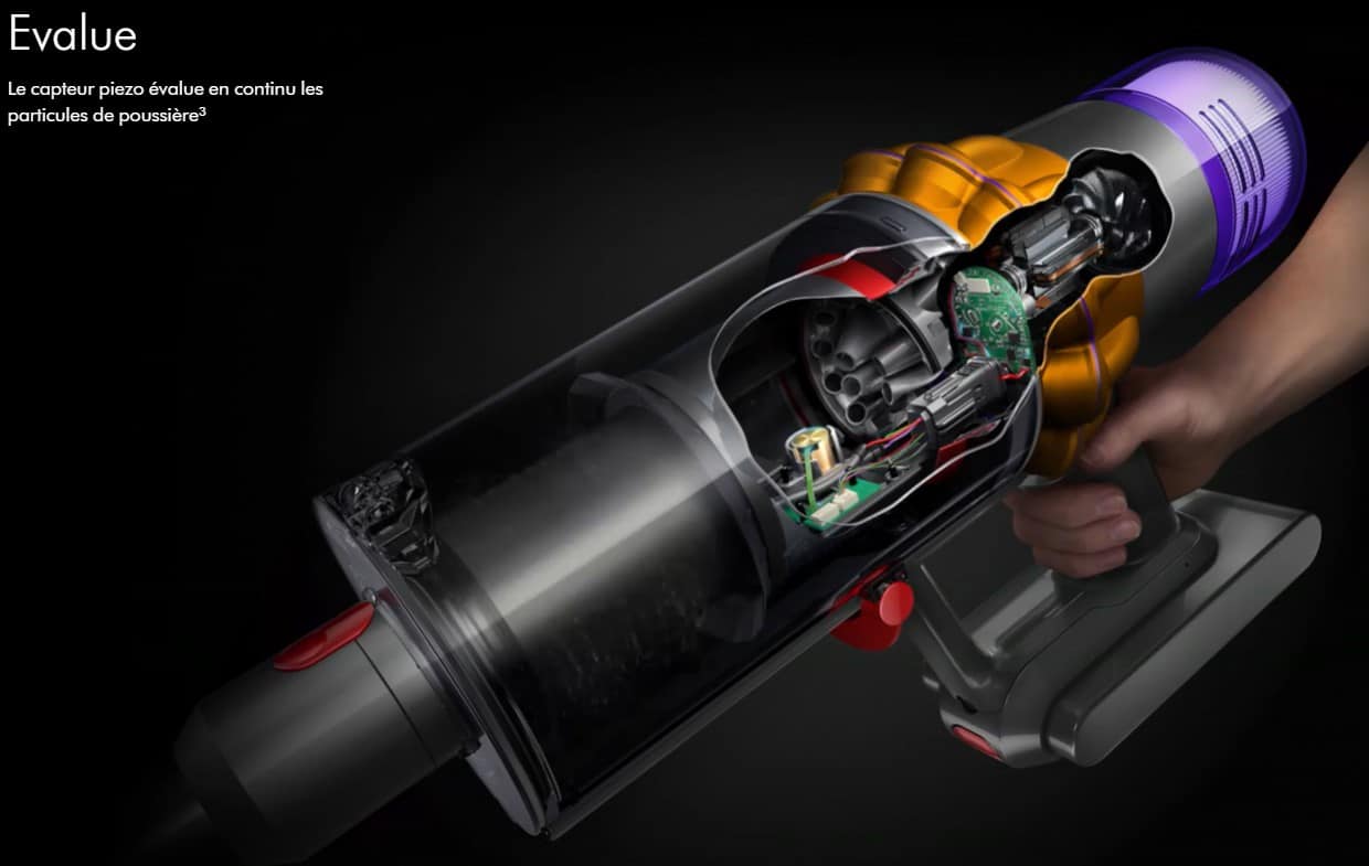 Enfin, un nouveau capteur piezo mesure les particules pendant que vous aspirez. Le Dyson V15 Detect vous affichera les données en temps réel sur l’écran LCD et adaptera sa puissance d’aspiration en cas de concentration élevée de poussière.