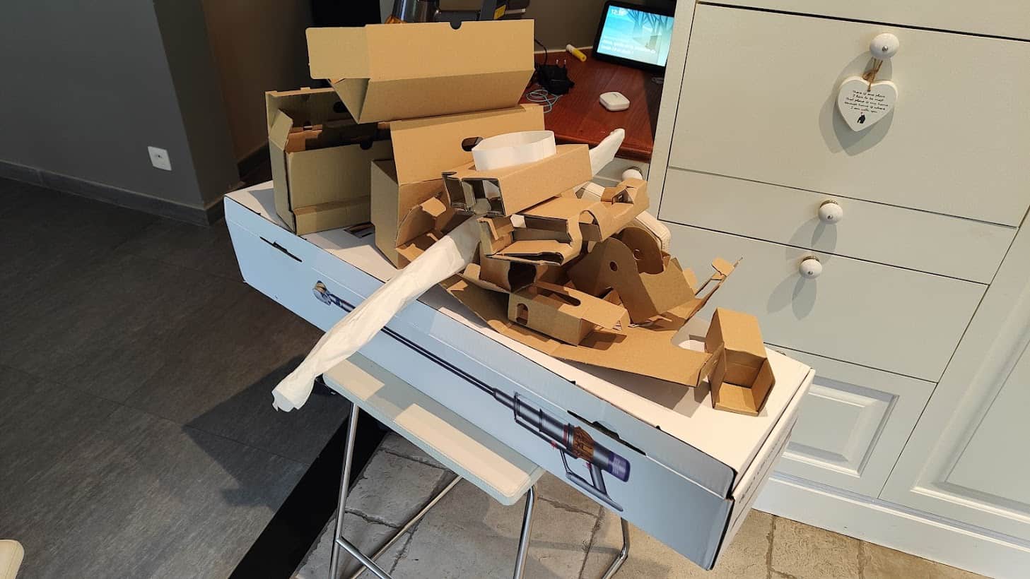 L’emballage du pack Dyson V15 Detect Absolute est fidèle à la philosophie premium de la marque, les éléments sont soigneusement ordonnés et protégés, et pratiquement tout est recyclable. Dans la boîte vous retrouvez :