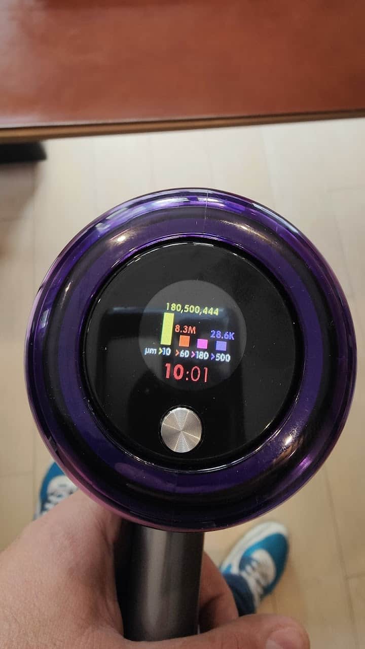 Le Dyson V15 Detect démarre au quart de tour. Les capteurs de surface et de propreté effectuent un travail impeccable. L’aspirateur sans fil adapte sa puissance en une fraction de seconde et l’on ressent bien la différence. Le capteur piezo qui mesure les particules au fur et à mesure donne un côté ludique, le fait de voir les statistiques augmentées sur l’écran LCD est presque motivant.