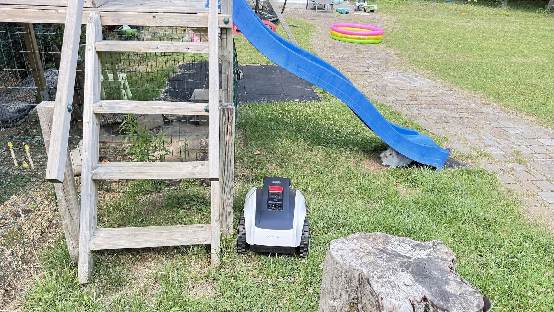 La tonte demande plusieurs passages pour un rendu bien homogène, mais le résultat est au rendez-vous. Le robot détecte les chemins étroits (jusqu’à 70 cm) et s’y engage sans souci. La caméra embarquée est un gadget sympathique, mais pas indispensable. J’ai également pu constater une bonne tenue sur terrain sec, mais sur sol humide, comme beaucoup de modèles, il peut légèrement patiner.