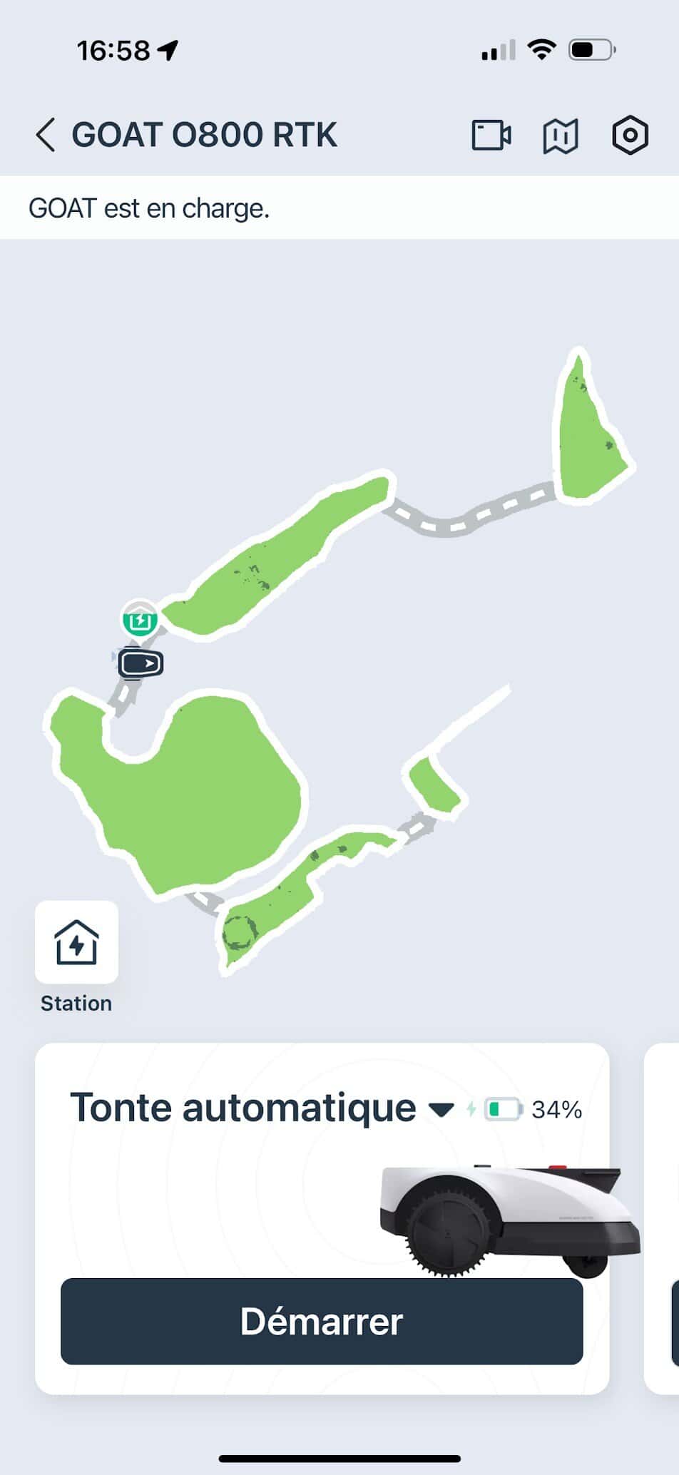J’ai testé ce robot dans un jardin varié, mêlant surfaces dégagées, passages étroits et quelques pentes légères. Le montage de la station est simple, l’antenne RTK se fixe rapidement, et le robot commence sa cartographie sans difficulté. Lors de l’utilisation, j’ai apprécié le silence relatif du robot (57 dBA)**, qui permet de le faire fonctionner en soirée sans gêner le voisinage.