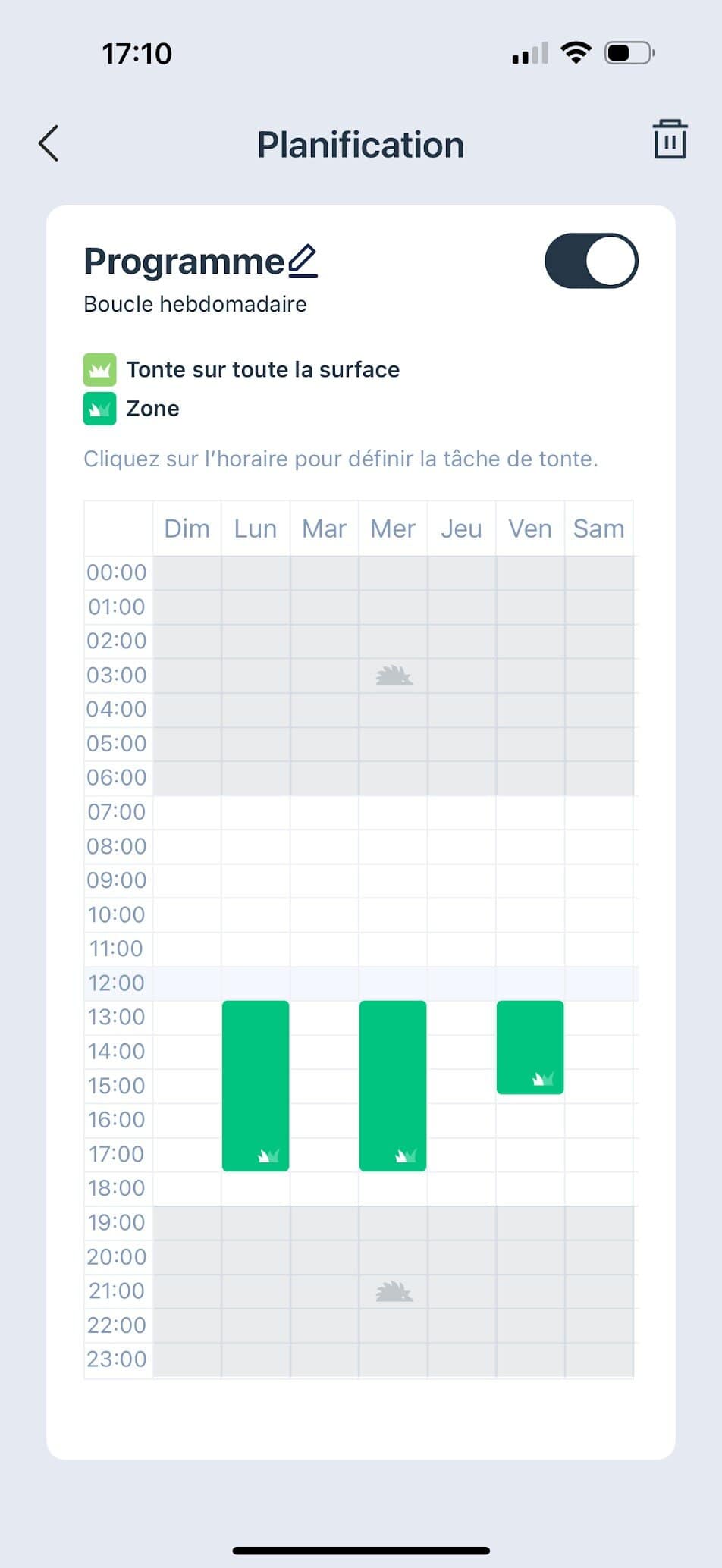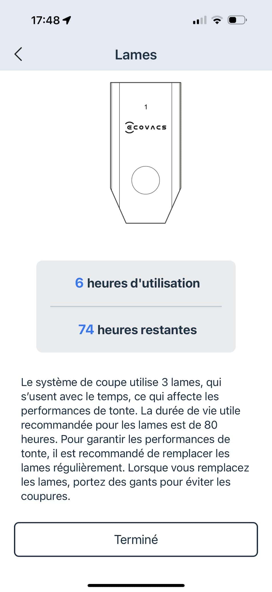 L’application Ecovacs est particulièrement bien conçue. En quelques gestes, on peut créer et modifier des zones, (comme on a l’habitude de le faire avec les robots aspirateurs) et définir des hauteurs de coupe, choisir des horaires de passage, et même activer des restrictions de tonte pour protéger les animaux domestiques. Il est également possible de piloter manuellement le robot pour finaliser les zones complexes ou effectuer des ajustements ponctuels.