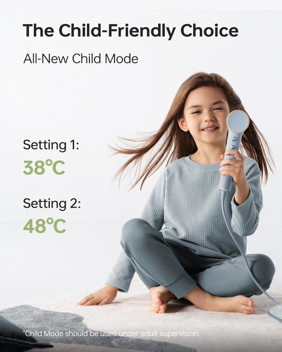 Malgré sa taille, il propose une puissance remarquable grâce à son moteur sans balai de 110 000 tr/min et ses optimisations de débit d’air. Innovant, il propose un mode enfant sécurisé avec des réglages adaptés aux cheveux fins : 38°C et 48°C.