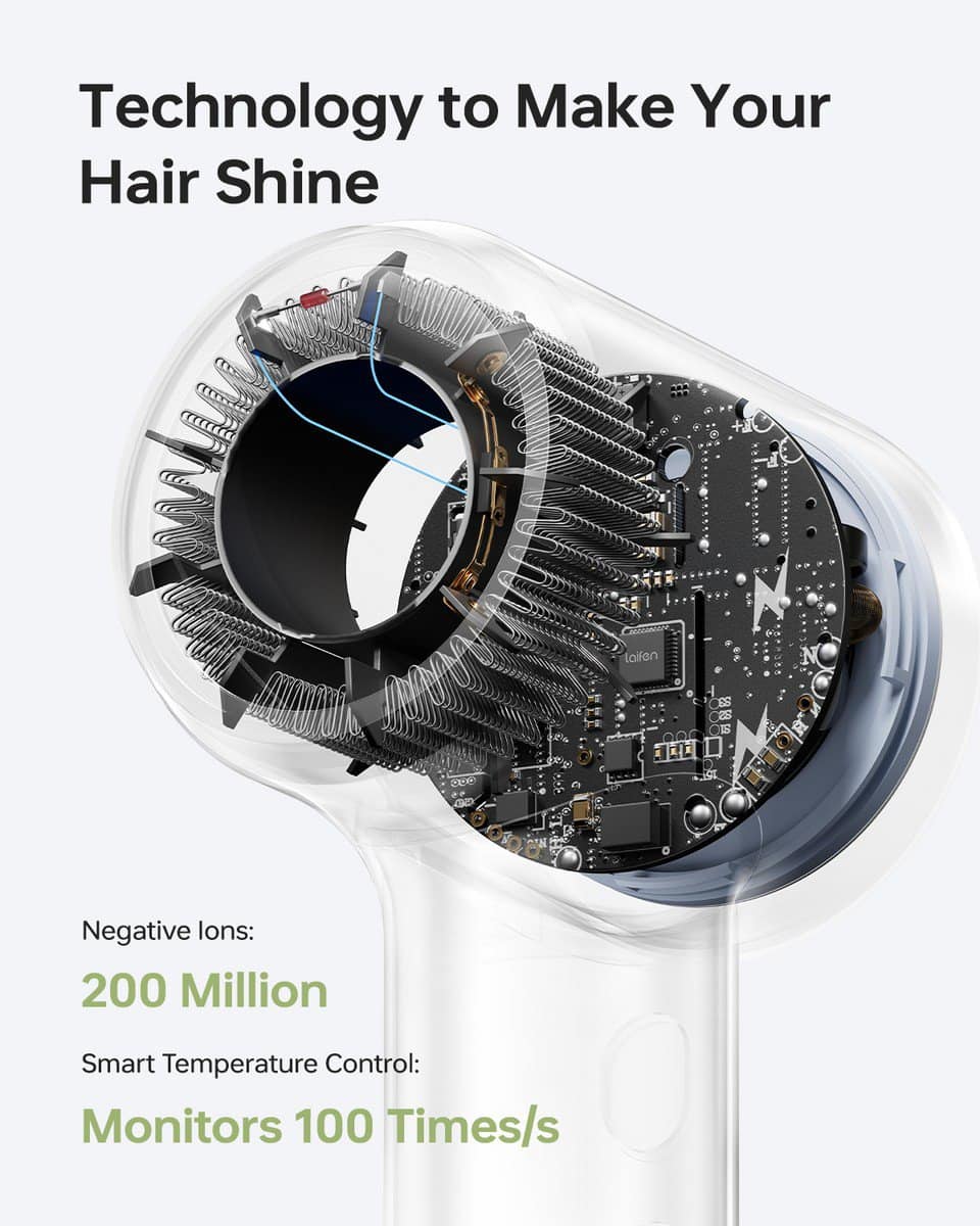 Son design premium, doté d’une peinture tactile UV et disponible en quatre couleurs mates, assure une prise en main confortable. Côté technologie, il diffuse 150 millions d’ions négatifs pour éliminer les frisottis et protège vos cheveux avec son contrôle intelligent de la température, pour un séchage sain et efficace.