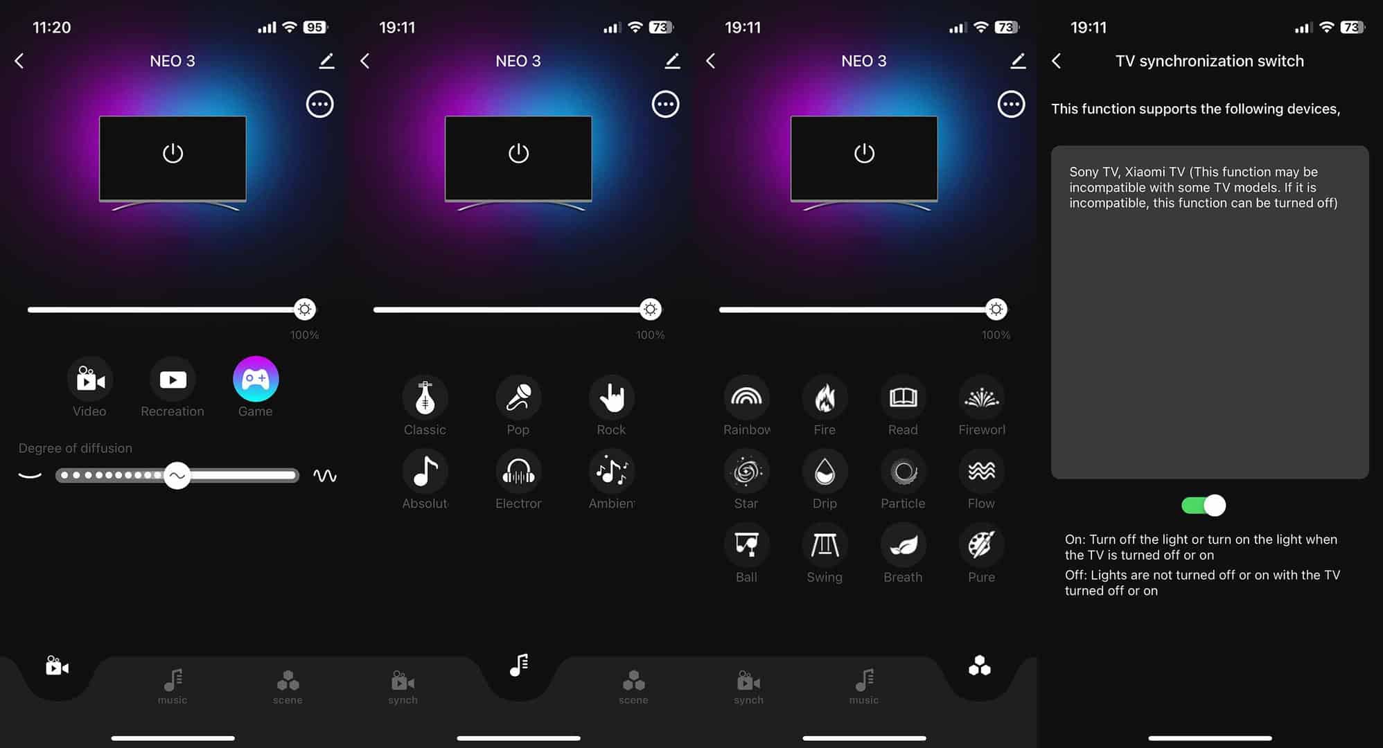 Parlons également de la bande de rétroéclairage dernier cri du Lytmi Fantasy 3 qui dispose de 72 LED par mètre et qui permet de bénéficier d’effets lumineux vraiment bluffants. De plus, le boitier est capable de sélectionner les meilleures couleurs et de les combiner pour obtenir la meilleure synchronisation possible, et ce même pendant des scènes d’action rapides. Bien entendu, il est possible de paramétrer le tout grâce à l’application Lytmi Home. On y retrouve des modes préenregistré destinés au cinéma ou au gaming, on peut également changer la luminosité ou le degré de diffusion de la lumière, ou tout simplement créer des scènes, un peu à la manière des ampoules Hue. Cerise sur le gâteau, si on a une TV Sony ou Xiaomi, on peut même faire en sorte que le kit s’allume et s’éteigne en même temps que son téléviseur. Bref, vous l’aurez compris, le tout se veut très qualitatif et rempli de très chouettes fonctionnalités.