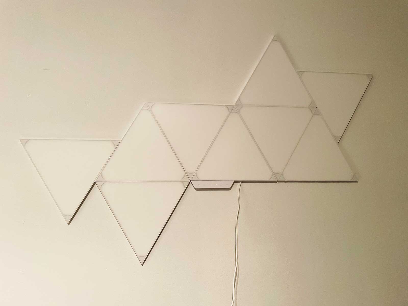 Les Nanoleaf Shapes sont des panneaux d’éclairage intelligents conçus pour être fixés au mur. Ils sont disponibles en différentes formes et tailles et peuvent être connectés entre eux pour créer des motifs personnalisés. En ce qui me concerne, j’ai reçu un kit de démarrage composé de neuf panneaux triangulaires. Ceux-ci sont dotés de RGB et peuvent produire jusqu’à 16,7 millions de couleurs. Grâce à leur application mobile, on peut contrôler l’éclairage et créer ses propres scènes en fonction de son humeur. À noter que ces panneaux sont compatibles avec l’assistant vocal Amazon Alexa et Google Assistant, il est donc possible de les contrôler à la voix. Ils sont également compatibles avec Apple HomeKit et IFTTT, ce qui vous permet de les intégrer à votre système de domotique. Enfin, signalons que le tout est écologique grâce à une faible consommation d’énergie.