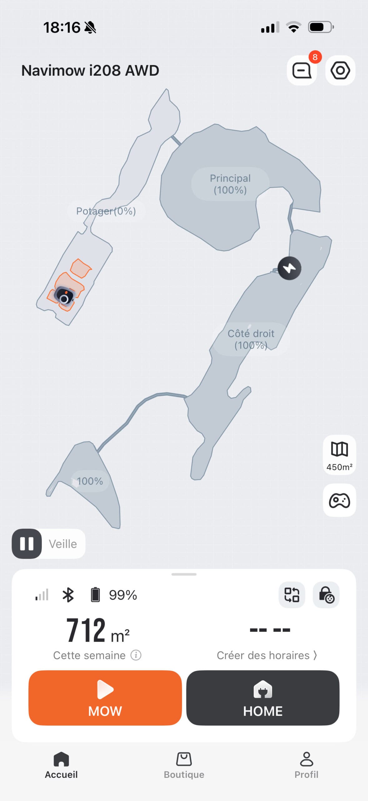 En parlant d’installation, la mise en route est bluffante de simplicité. Tout est extrêmement bien fait, l’application est vraiment conviviale et d’une facilité enfantine. J’ai pu dessiner ma carte directement depuis l’application en guidant le robot, définir des zones d’exclusion, et hop, c’était prêt ! Cela fait maintenant 3 semaines qu’elle tourne et je n’ai rencontré le moindre mal. Elle gère tout mon terrain sans sourciller, en y dessinant des lignes impeccables, comme sur un terrain de foot. J’ai activé la fonction AWD (attention, ce n’est pas automatique, il faut bien aller la cocher dans les options !) et le résultat est top. Elle possède un système antipatinage que j’apprécie fortement, ayant eu un ancien robot qui patinait et creusait mon terrain, le transformant en champ de boue.