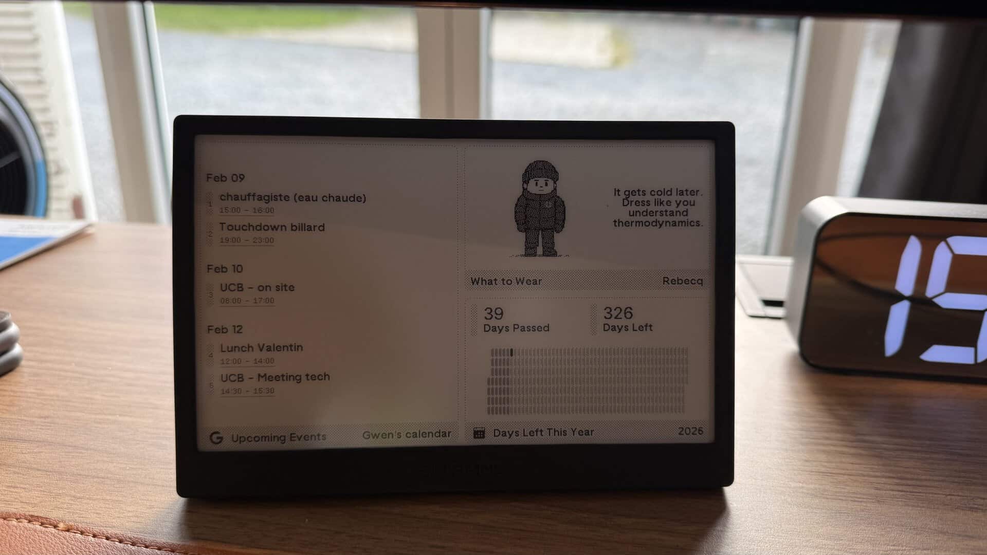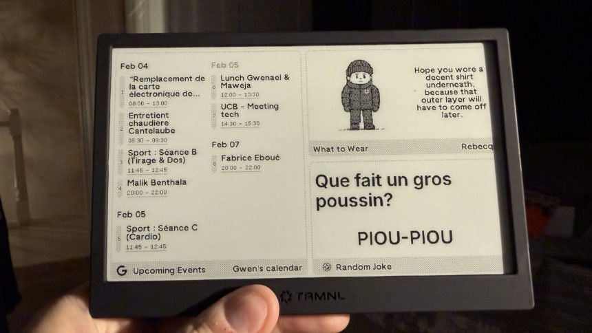 À l’usage, dans mon salon, le TRMNL se fait oublier jusqu’à ce qu’on ait besoin d’une info. Pas de rétroéclairage qui fatigue les yeux le soir, pas de scintillement. La batterie tient extrêmement bien grâce à la technologie E-ink qui ne consomme de l’énergie que lors du rafraîchissement de l’image. J’ai eu un plaisir réel à ne plus avoir à déverrouiller mon téléphone pour vérifier une info simple : un coup d’œil sur l’étagère suffit.