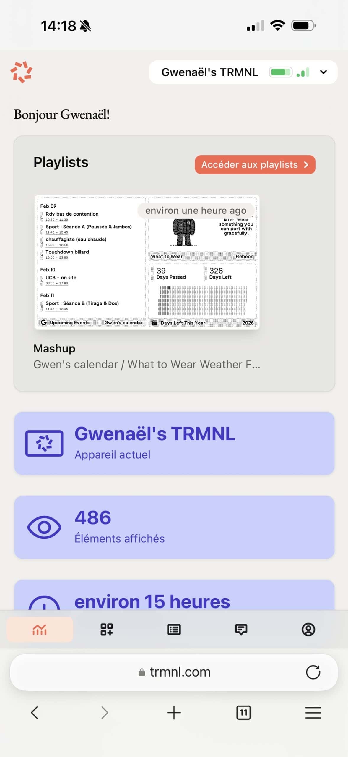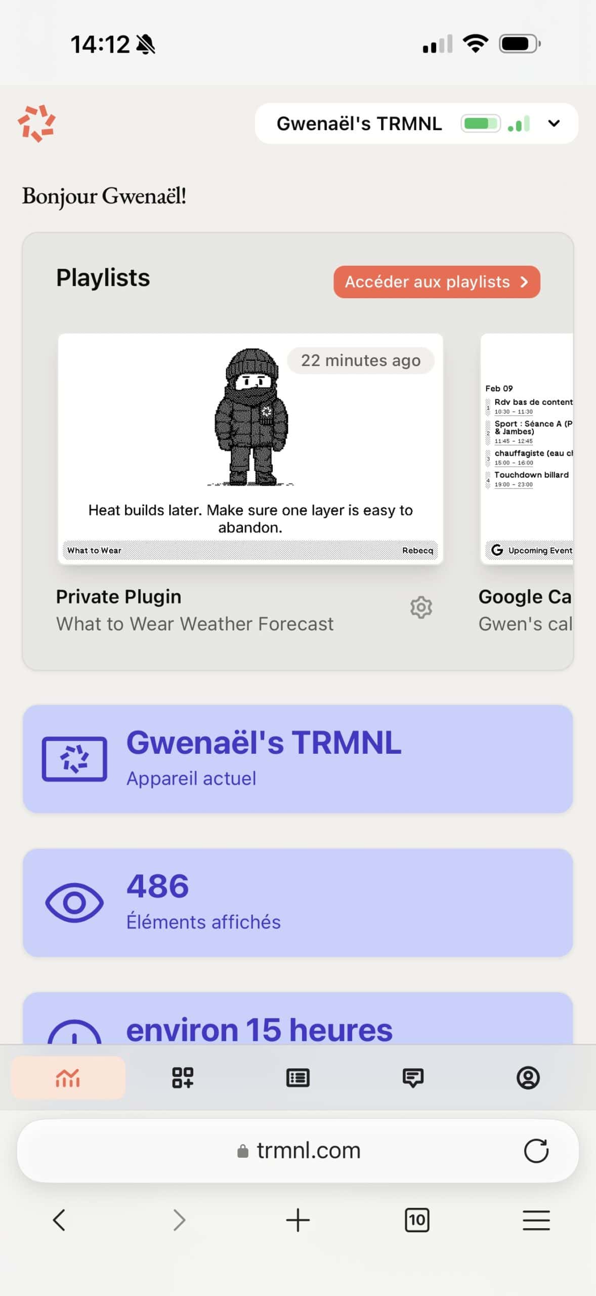 Le véritable tour de force du TRMNL, c’est son interface. Tout se passe sur le site internet dédié. Une fois le device connecté à mon Wi-Fi, j’ai pu configurer l’affichage en quelques clics. J’ai commencé par installer un plugin pour la météo et mon calendrier, et la synchronisation est quasi instantanée. On ne lutte pas avec une application mobile buggée, tout est fluide depuis le navigateur.