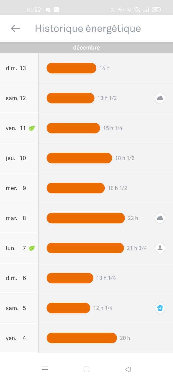 De plus, l’application permet de régler toutes les options citées précédemment et même la consultation de l’historique de l’énergie qui résume la consommation des 10 derniers jours et permet de mieux gérer les choix de températures.