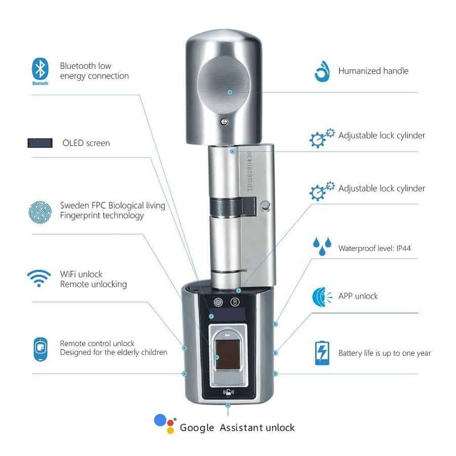 Cette smart serrure est fabriquée en acier inoxydable et alliage de zinc et pèse 408g. En ce qui concerne sa source électrique, cet engin a besoin de 3piles AAA.