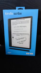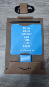 La Kindle Scribe est une liseuse grand format avec un écran 10.2 pouces bénéficiant de la technologie paperwhite. L’écran a une résolution de 300 pp et est éclairé par 35 LED (contre 17 pour une Kindle Paperwhite). Avec ses 433 grammes, elle est relativement facile à tenir en mains. J’ai en ma possession la version 16 Gb mais sachez qu’elle existe également en 32 ou 64 Gb. Outre la taille de l’écran, la grosse nouveauté de cette Kindle Scribe c’est son stylet. J’ai ici le modèle premium mais sachez qu’il existe également en version basique. La différence étant que le stylet premium dispose d’un bouton raccourci pour switcher entre le stylo et le surligneur par exemple mais aussi une gomme à son extrémité.