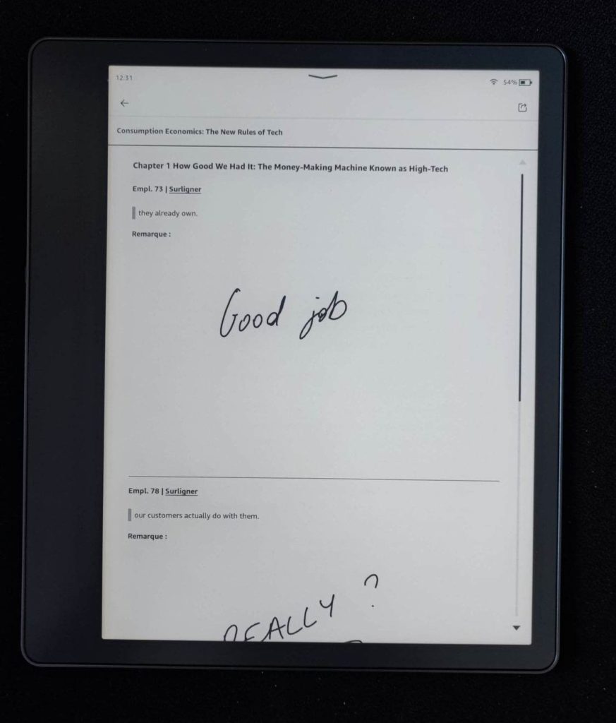 Ce que je recherchais avec cette solution, c’est de pouvoir prendre des notes manuscrites qui seraient ensuite retranscrites en texte dans un document PDF. Impossible pour l’instant avec la Kindle Scribe alors que d’autres modèles le font depuis un certain temps. Nul doute que les équipes Amazon corrigeront le tir à l’avenir via des mises à jour ou un nouveau modèle.