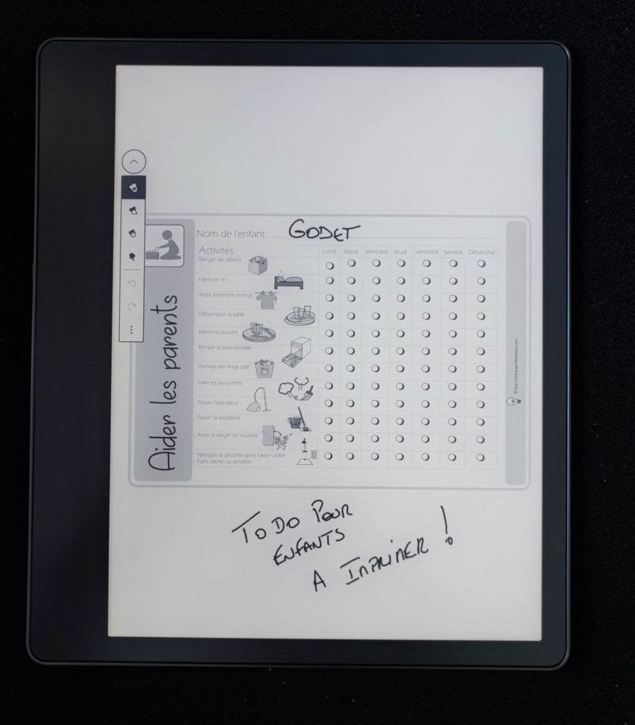 Pour ce qui est de l’option prendre des notes, la Kindle Scribe se débrouille bien mais tout n’est pas parfait loin de là. Si vous souhaitez prendre des notes sur une page blanche, vous aurez le choix entre 18 templates, de la page blanche au tableur en passant par la liste. La sensation d’écriture est parfaite et l’on a réellement la sensation d’avoir un stylo qui glisse parfaitement sur le papier. Le stylet premium vous permet de switcher entre le stylo et le surligneur en appuyant sur le bouton (vous pouvez également opter pour la gomme ou le pense-bête). La tête du stylet, lorsqu’elle est appuyée sur l’écran vous permet de gommer. Ça fonctionne vraiment super bien. Vous pourrez ensuite envoyer vos notes par email ou les sauvegarder sur votre Kindle. Aucune possibilité d’envoyer ça vers un OneDrive ou autre solution en ligne.