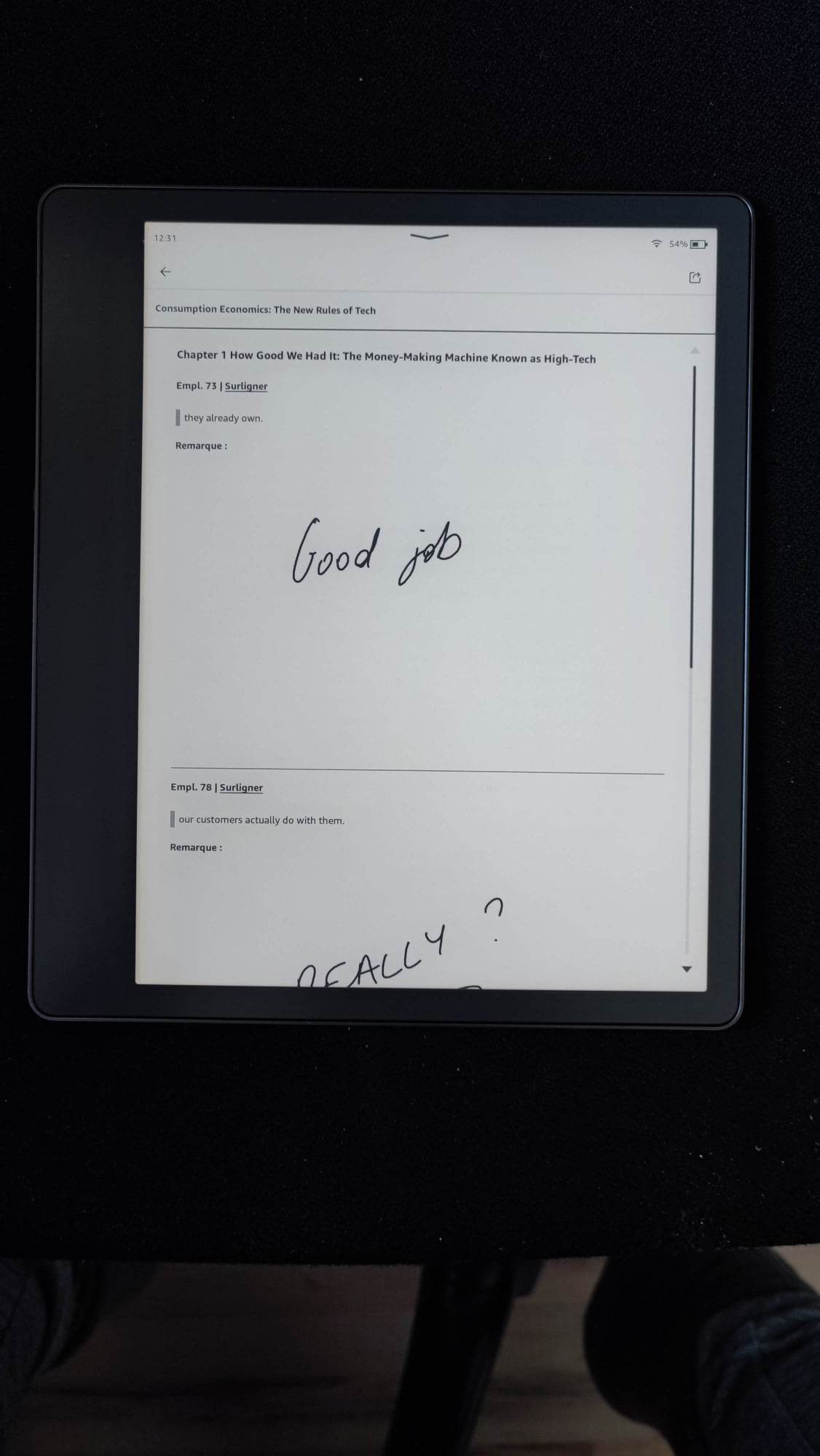 Ce que je recherchais avec cette solution, c’est de pouvoir prendre des notes manuscrites qui seraient ensuite retranscrites en texte dans un document PDF. Impossible pour l’instant avec la Kindle Scribe alors que d’autres modèles le font depuis un certain temps. Nul doute que les équipes Amazon corrigeront le tir à l’avenir via des mises à jour ou un nouveau modèle.