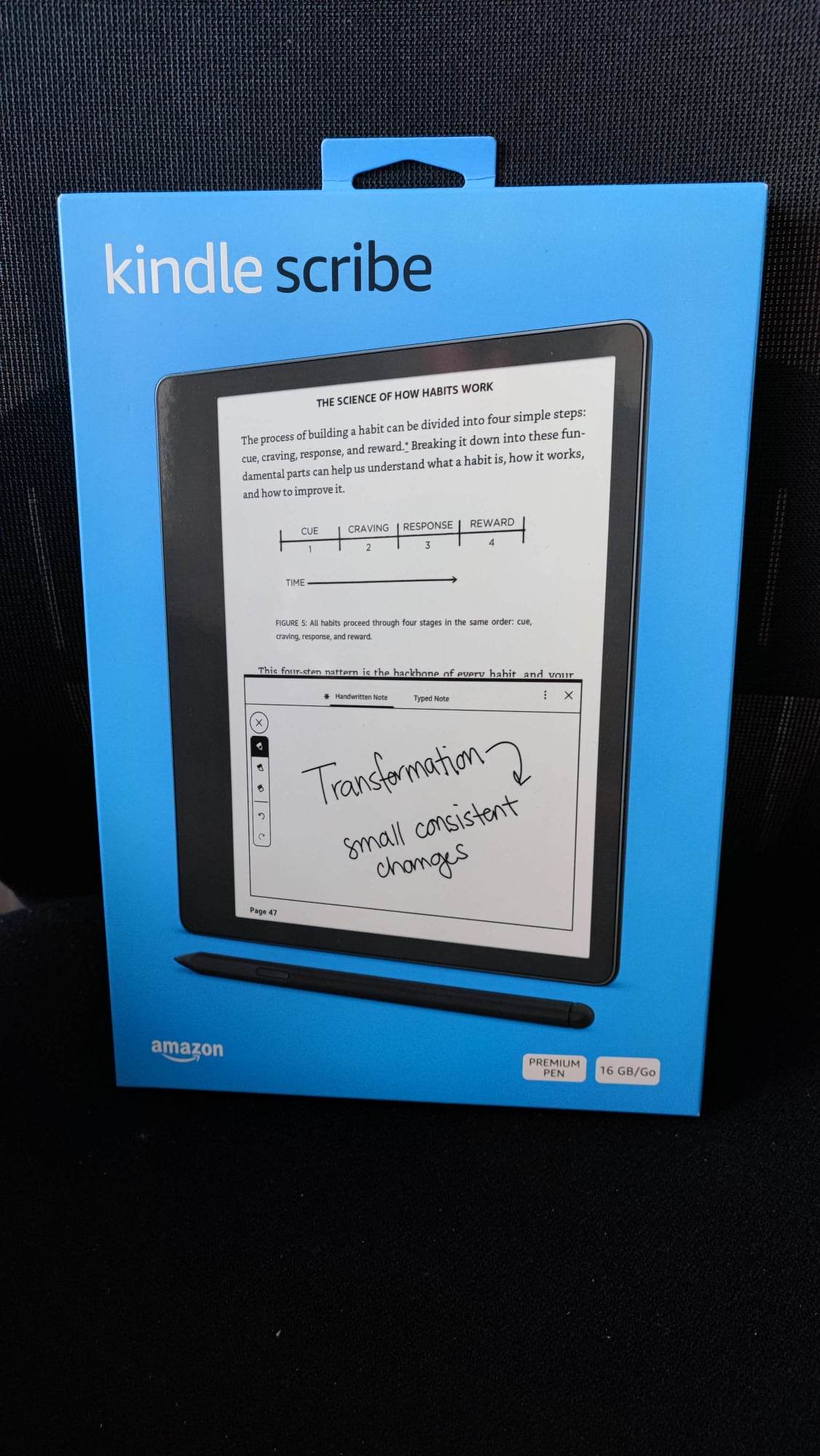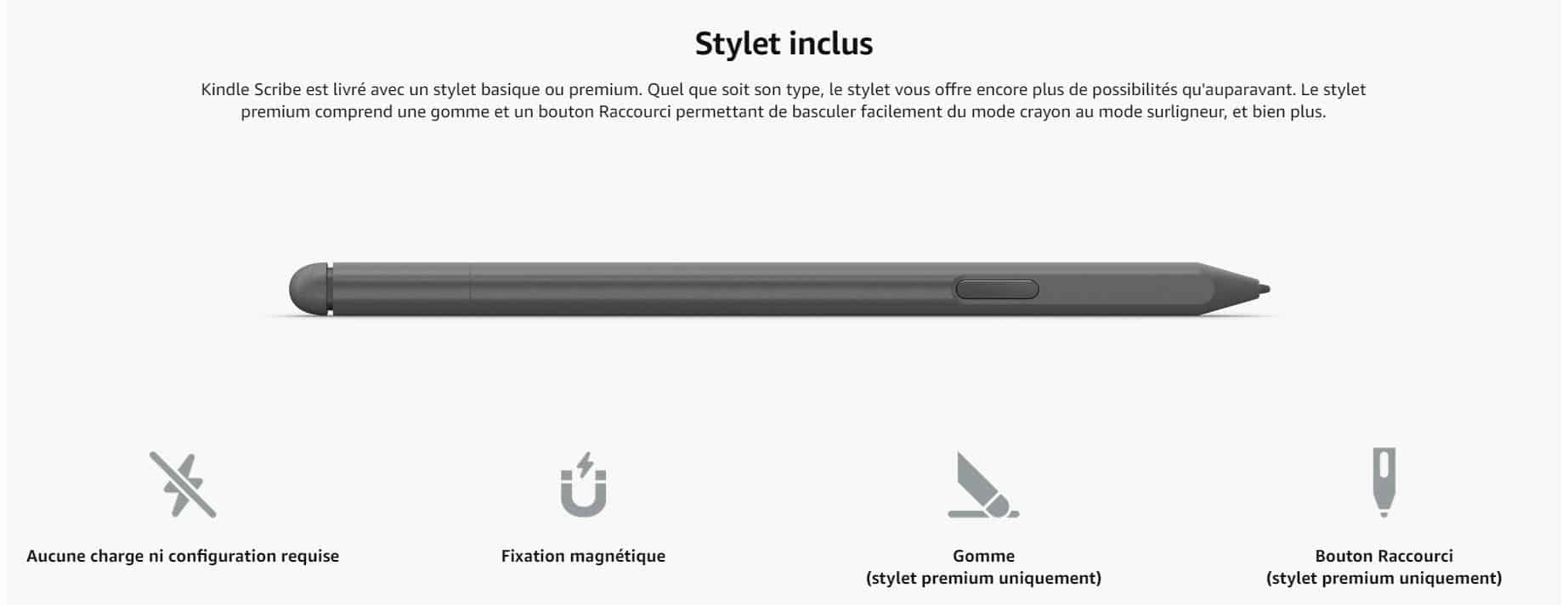 La Kindle Scribe est une liseuse grand format avec un écran 10.2 pouces bénéficiant de la technologie paperwhite. L’écran a une résolution de 300 pp et est éclairé par 35 LED (contre 17 pour une Kindle Paperwhite). Avec ses 433 grammes, elle est relativement facile à tenir en mains. J’ai en ma possession la version 16 Gb mais sachez qu’elle existe également en 32 ou 64 Gb. Outre la taille de l’écran, la grosse nouveauté de cette Kindle Scribe c’est son stylet. J’ai ici le modèle premium mais sachez qu’il existe également en version basique. La différence étant que le stylet premium dispose d’un bouton raccourci pour switcher entre le stylo et le surligneur par exemple mais aussi une gomme à son extrémité.