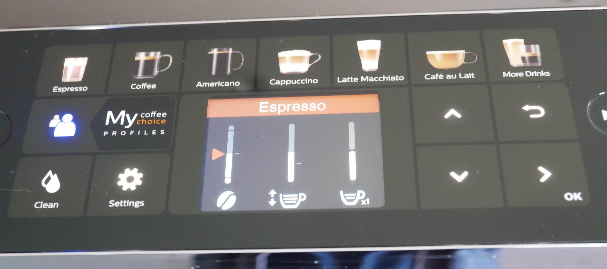 L’ensemble des sélections ou réglages se font sur une sorte de tableau de bord qui n’est pas un écran tactile. Les touches des boissons sont prédéfinies et les réglages au niveau quantité ou intensité se font via des touches spécifiques. Seul un autre petit écran central indique les réglages sélectionnés ou des informations lorsqu’il faut nettoyer la machine, rajouter de l’eau…