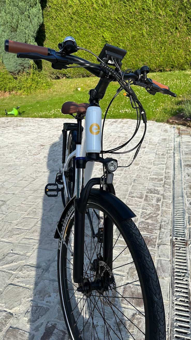 Au niveau des composants, le vélo à fière allure ! Le cadre en aluminium lui procure un poids certain de 26 kg et la version testée est celle dite « pour femme » (sans barre horizontale). Je vous recommande d’ailleurs d’opter pour cette version. Ainsi, lorsque vous utilisez votre vélo avec un siège bébé ou des bagages, cela vous évitera de perdre l’équilibre.