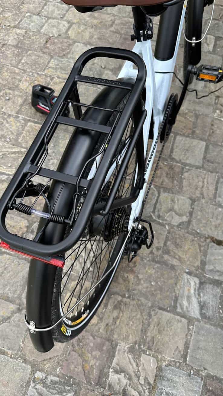 Pour moins de 1 000 €, l’ensemble à fière allure et dispose de tous les accessoires bien pratiques pour la ville : des gardes-boues, lampe avant, lampe arrière, porte bagage, catadioptres.
