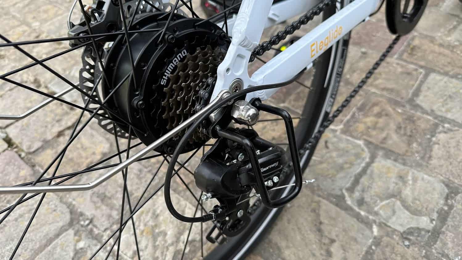 Pour la partie purement vélo, on retrouve un dérailleur sept vitesses Shimano un peu daté, mais totalement qualitatif. Les pneus CST disposent de la norme protection level 5 assurant une bonne résistance.