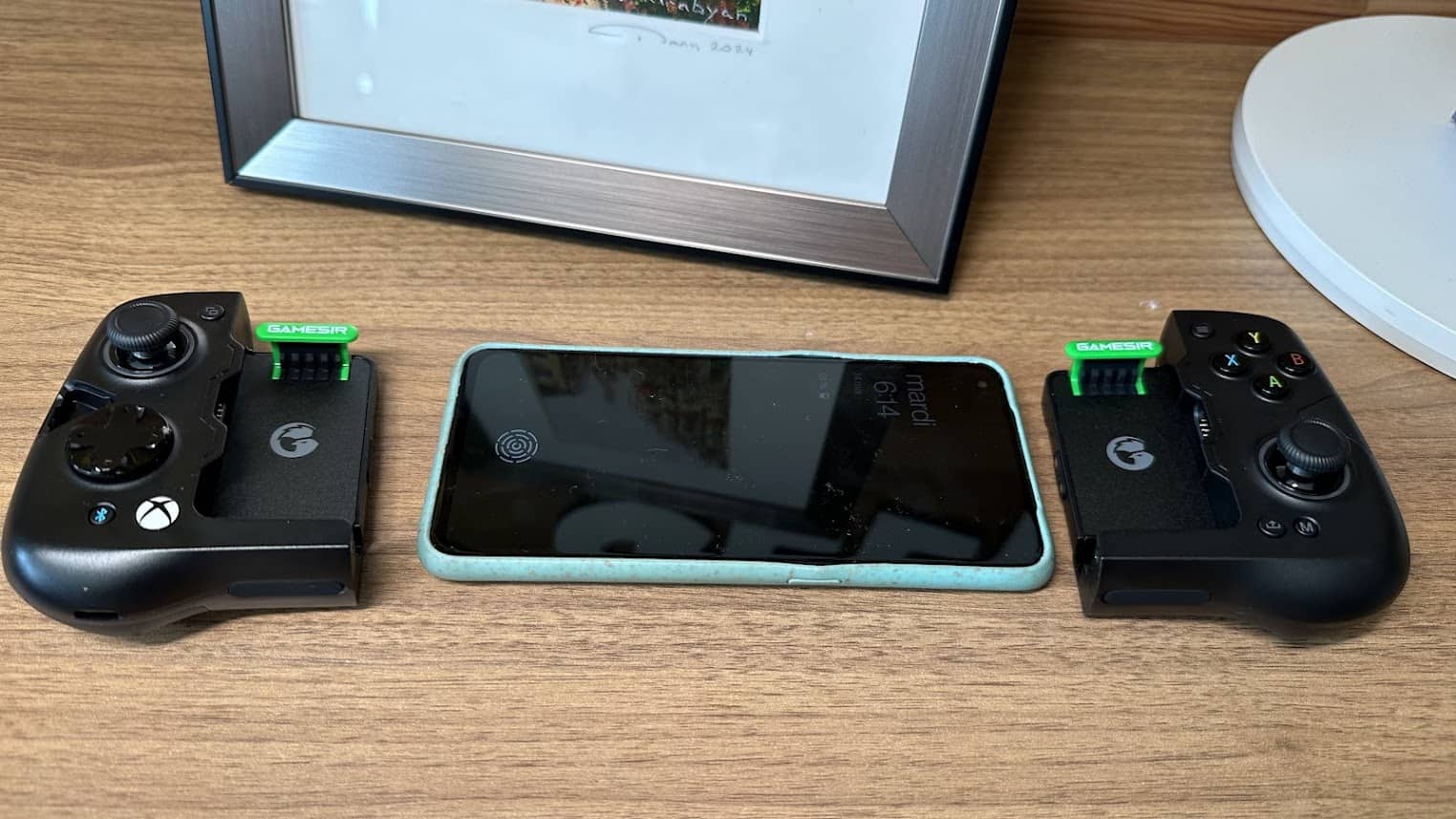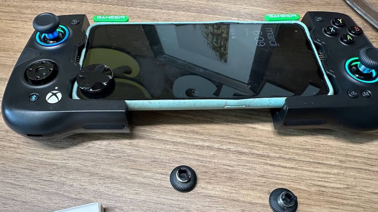 Les deux éléments Gamesir vert sur le dessus, ne sont pas là juste pour décorer : ils servent de point d’accroche pour votre smartphone et aussi d’intérupteur : en effet, dès qu’ils sont relevés, la manette s’allume.