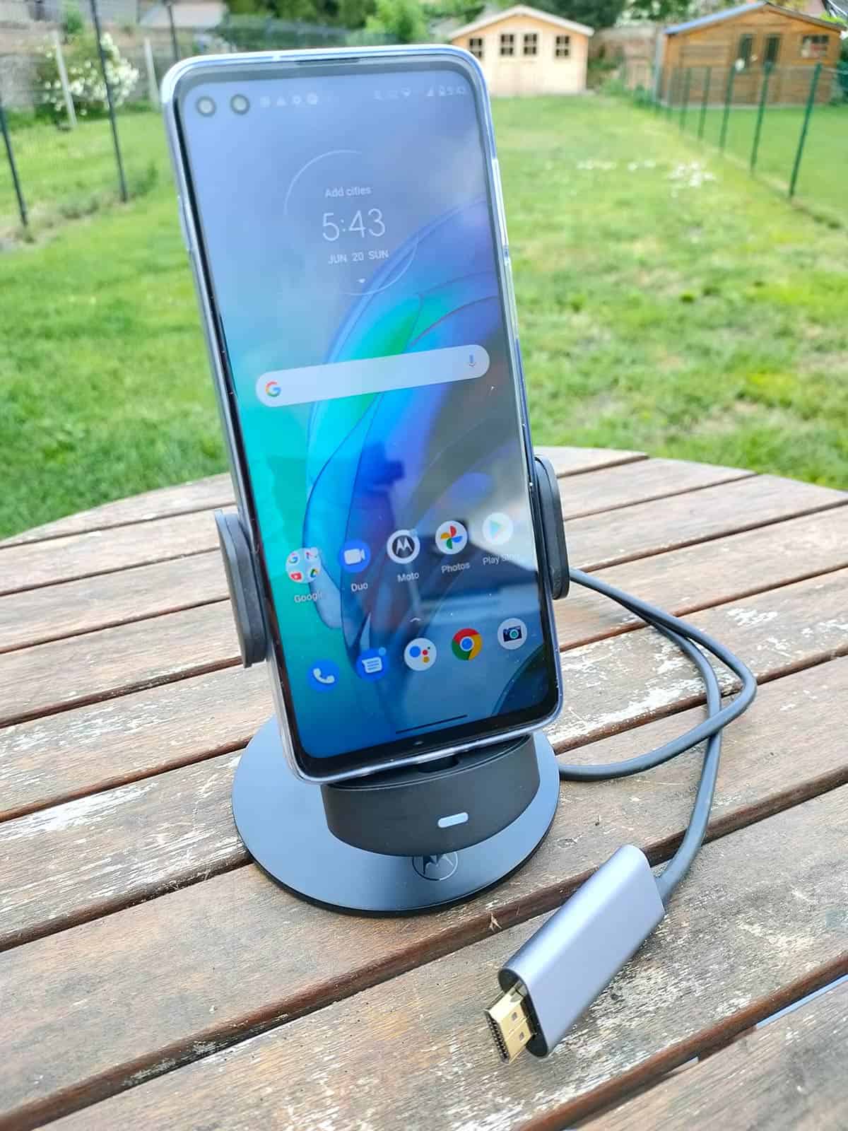 Ce qui m’amène sans transition au point qui fâche : le moto g100 a tendance à vite chauffer et encore plus quand il est en mode Ready For. Heureusement Motorola a pensé à tout puisqu’il est possible de se procurer séparément une dock station ajustable qui est équipée d’un ventilateur pour refroidir le smartphone. Et franchement, cet accessoire est vraiment très chouette puisqu’il permet, par exemple, de passer ses appels vidéos tout en travaillant dans ses Googles Docs. Petit détail qui tue : il est même possible de retourner son smartphone pour passer ses appels vidéos en haute-définition grâce à la caméra 64 Mégapixels. Un régal !