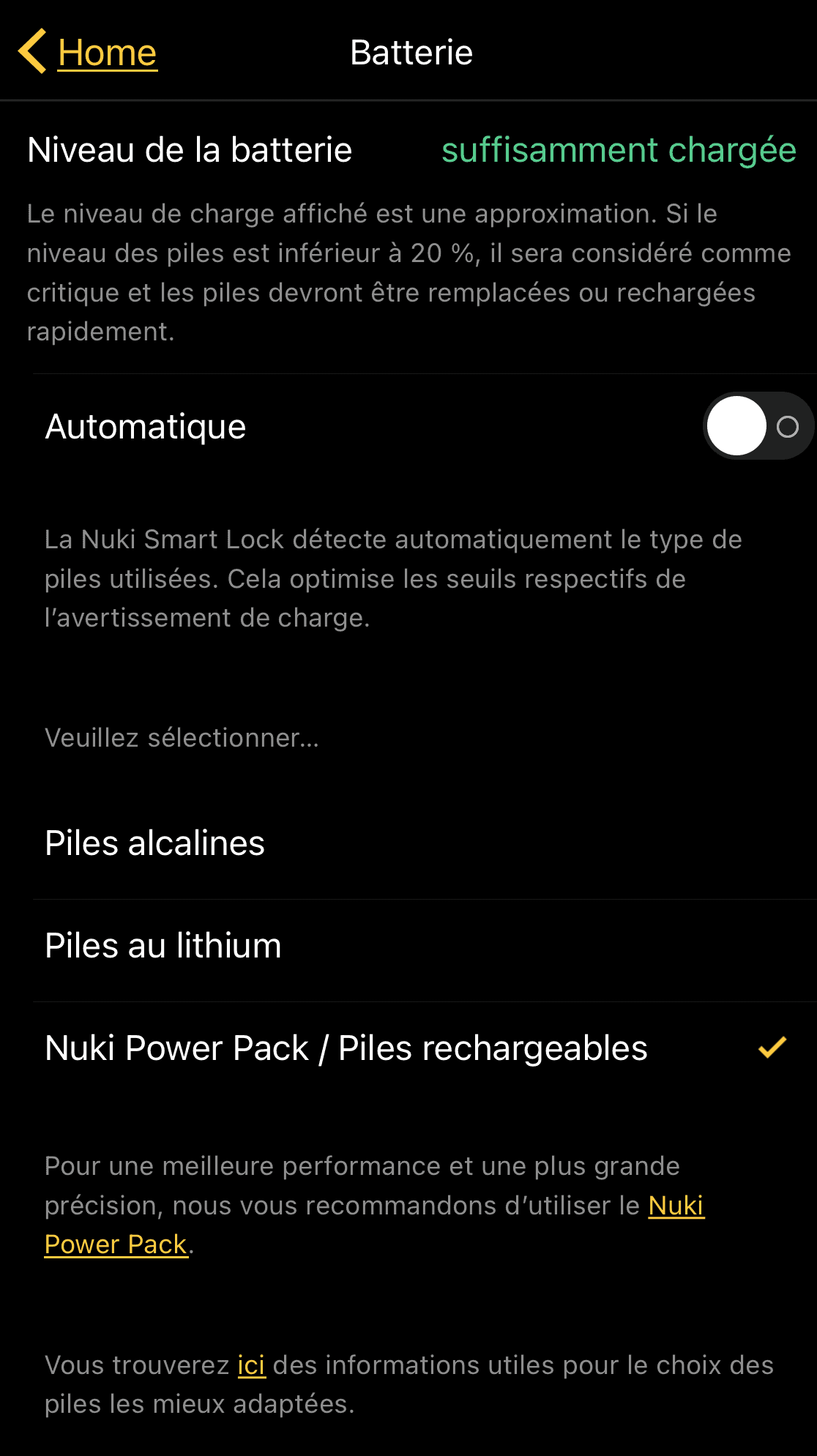 Dernier point, afin de profiter de votre Power Pack, vous devez aller changer une option dans les paramètres du Nuki Smart Lock. Dans la partie batterie, désactivez la fonction automatique et sélectionnez ‘Nuki Power Pack’