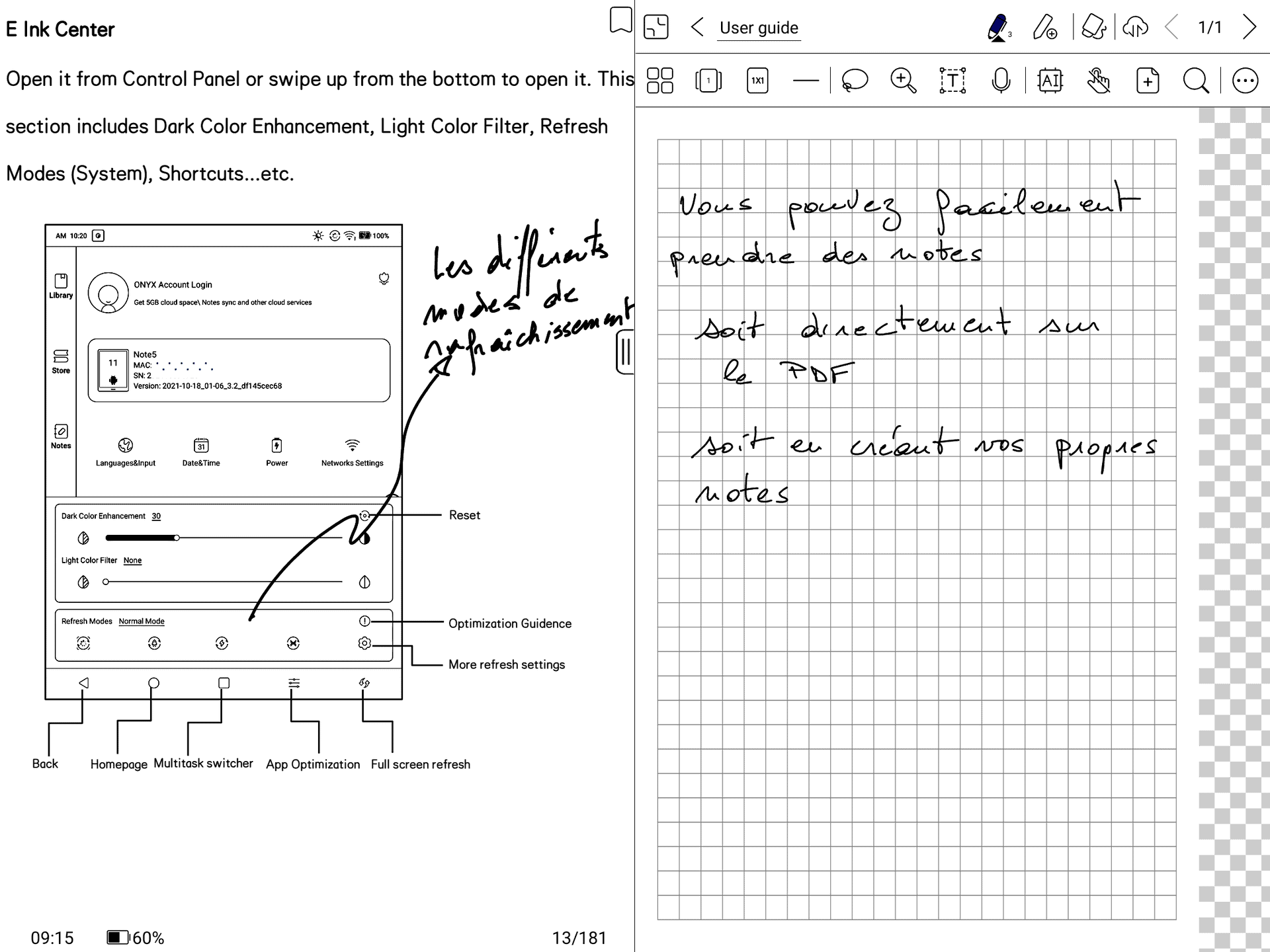 Autre nouveauté bien utile, la possibilité de créer plusieurs modes d’écriture. Jusqu’ici, chaque fois que l’on souhaitait passer d’un stylo plume à un stylo bille, il fallait modifier le mode d’écriture en cours d’utilisation. Avec la dernière version du système, il est possible de créer plusieurs modes et de passer de l’un à l’autre en un simple click. Cette fonction est très pratique pour le dessin notamment puisque l’on peut définir plusieurs épaisseurs de trait ou couleurs pour des crayons ou des pinceaux. Vous noterez que je parle également de couleurs car, bien que n’affichant que du noir et blanc, une fois exportées, les notes ou dessins sont affichés avec les couleurs utilisées. Très utile lorsque vous surlignez des documents PDF ou réalisez des croquis.