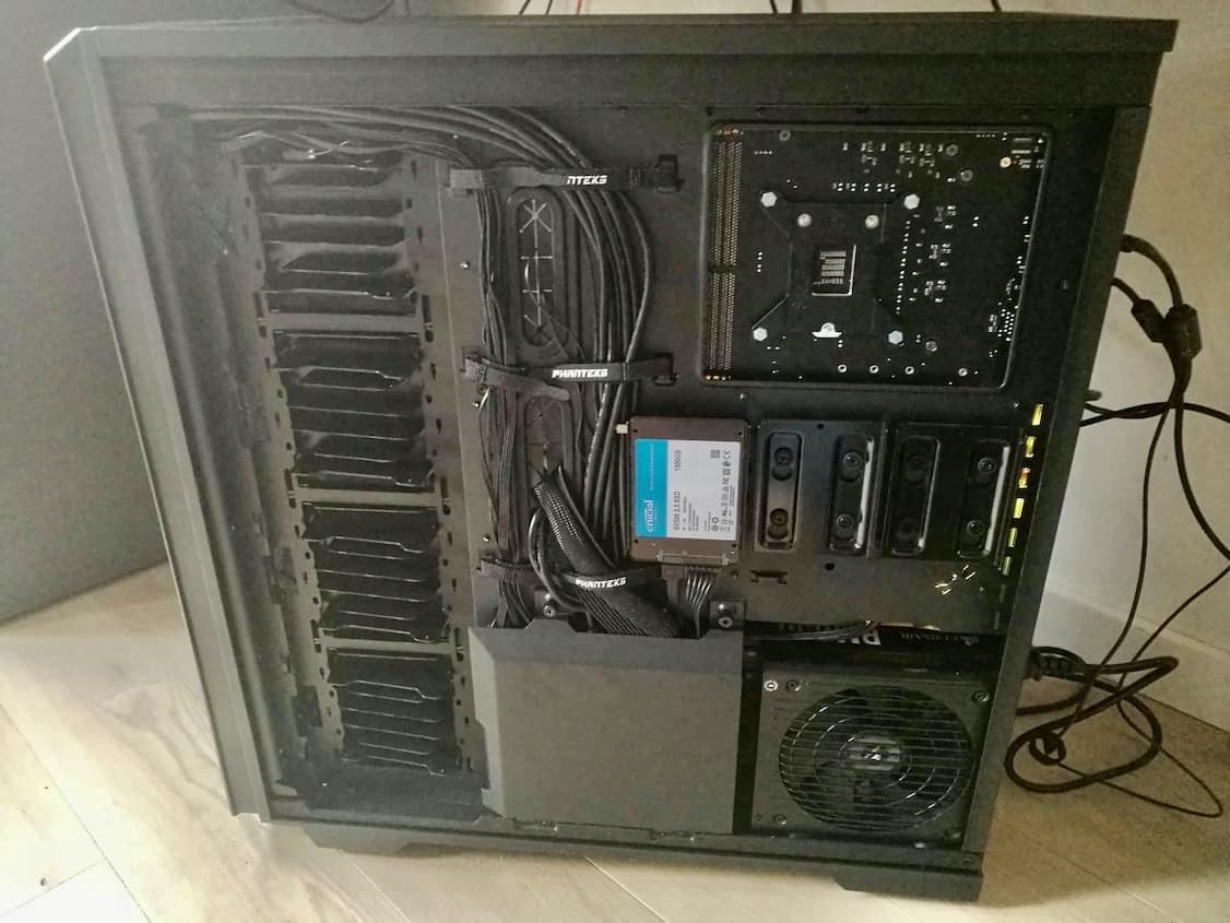 Sur toutes les photos on voit toujours l’intérieur du PC. Mais la Enthoo Pro 2 cache aussi une face arrière extrêmement bien pensée et qui permet à tous les maniaques, comme moi, de ranger ou cacher les câbles sans soucis. Mêmes les disques SSD 2,5″ trouveront une place où se poser à cet endroit.