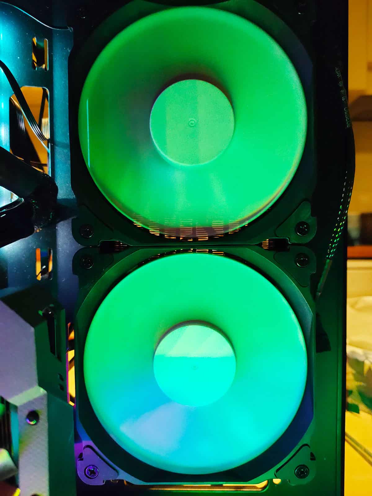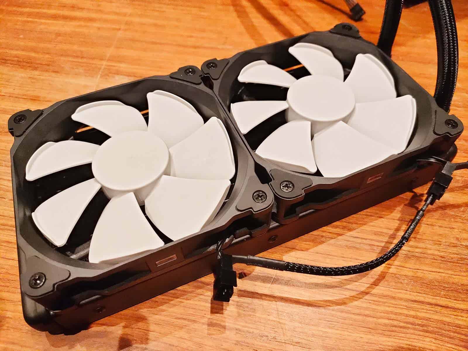 Le radiateur du Phanteks Glacier One est équipé de deux ventilateurs de type MP. En plus d’être efficaces, ces fans sont extrêmement silencieux et c’est selon moi un des gros points forts de ce watercooling AIO. Ces derniers sont munis de gros patins en caoutchouc afin d’éviter toute vibration et c’est vraiment très appréciable. À titre de comparaison, je les trouve même plus silencieux que les Pure Wings 2 de chez be quiet, ce qui est loin d’être négligeable. Autre détail très sympathique, il est possible d’alimenter les ventilateurs en série grâce à un système de “Daisy Chain“. Comprenez qu’il suffira de brancher le premier ventilateur au deuxième et de les alimenter avec un seul port CPU Fan. Le radiateur du Phanteks Glacier One est quant à lui assez classique tout en étant de très bonne facture. Je n’ai donc rien de spécial à signaler à son sujet.