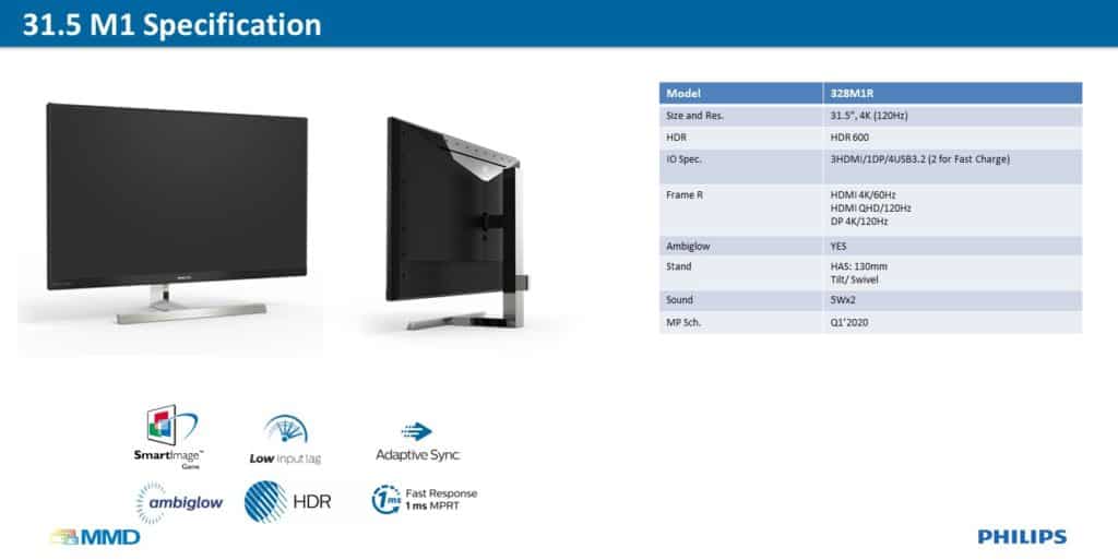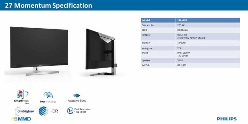 A noter que cette présentation était également l’occasion pour MMD/Philips de présenter le reste de la gamme Momentum. D’abord avec le 31,5” Philips Momentum 328M1R qui affiche également une résolution 4K et une fréquence de rafraîchissement de 120 Hz, doublées d’une certification HDR 600 et surtout d’un temps de réponse de 1ms.