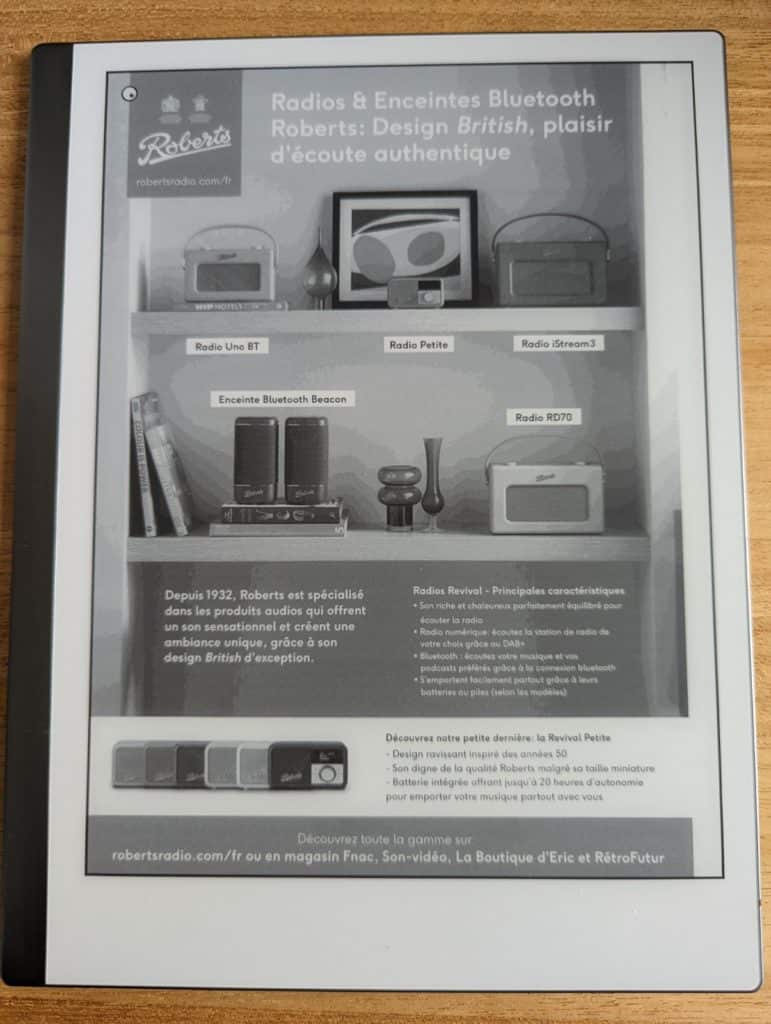 L’écran de 10,3 pouces, de type CANVAS de seconde génération, est à encre électronique et ne permet pas d’afficher de couleurs comme on commence à le voir chez certains concurrents.