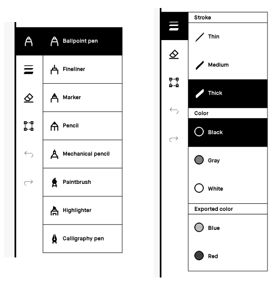 Plusieurs types de marqueurs sont disponibles : du crayon au stylo plume en passant par le pinceau ou le surligneur. La reMarkable 2 ne propose malheureusement que 3 tailles et quelques maigres couleurs pour chacun. Le strict minimum mais sans plus.