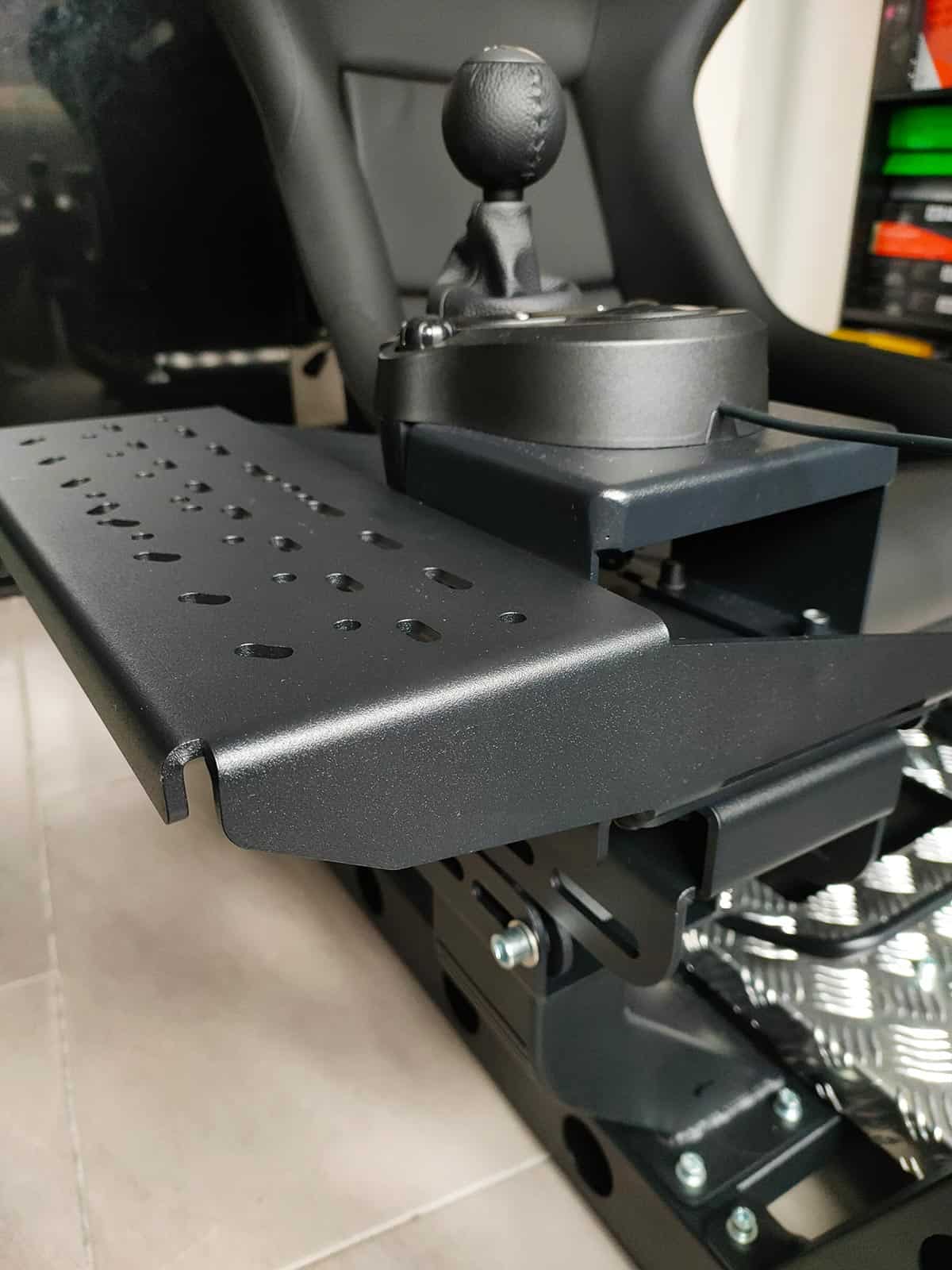 J’ai également reçu un support pour levier de vitesse et frein à main qui, lui non plus, n’est pas compris avec le RSeat B1 et qui coûte 199 euros. Celui-ci peut être monté à gauche ou à droite du châssis et ressort légèrement vers l’extérieur. Son fonctionnement est identique à celui de la console du volant puisqu’en plus de son pied, il est composé de 4 pièces qui permettent d’ajuster sa hauteur, sa profondeur et son angle d’inclinaison. Une fois que le support est en place, il n’y a plus qu’à venir y fixer son changement de vitesse. Le tout comprend également un rehausseur si on veut, par exemple, installer un levier de vitesse Logitech et un support additionnel pour frein à main. Si j’avais cependant un petit reproche à faire à ce système, c’est que je trouve le tout un peu haut même si la hauteur est réglée au minimum. Mais honnêtement, c’est un détail.