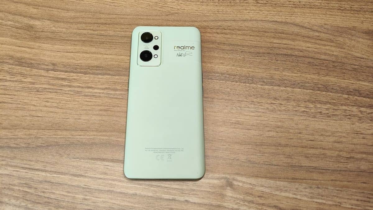 Une fois le smartphone en main, on se retrouve face à un design familier pour Realme, mais la marque insuffle tout de même un peu d’originalité. En effet, pour se démarquer en matière de design, on se retrouve avec une coque arrière en composite de papier, un matériau durable. Il s’agit d’une sorte de biocomposites qui a l’avantage d’alléger le smartphone (195 g). Son côté texturé avec un maillage fin assure une bonne prise en main et l’appareil propose un aspect soigné.