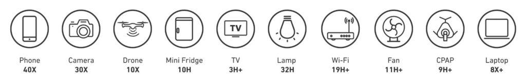Ce que vous pourrez recharger ou faire fonctionner et combien de temps :