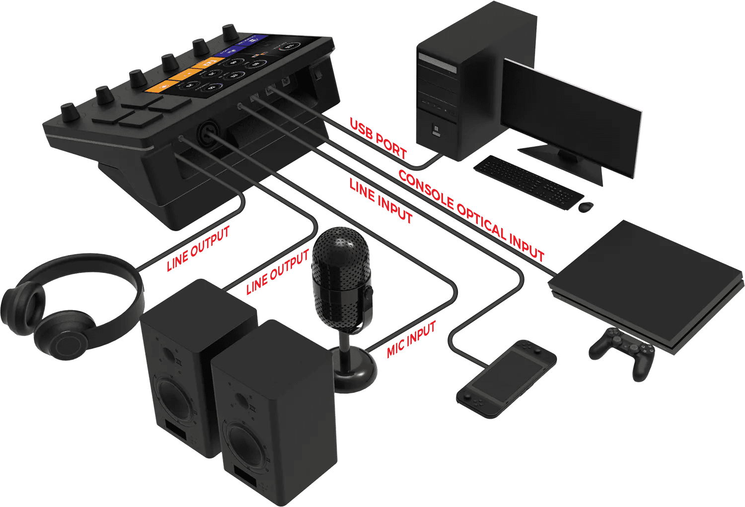 Vous pouvez également raccorder une autre source sonore comme un smartphone ou un iPod via le ligne INPUT. Une prise optique permet d’amener le son de votre console. Attention, car les PS5 et Xbox Series ne sont pas munies de sortie optique. Une PS4 oui par contre. La prise USB permet donc de ramener tout cela à votre PC.