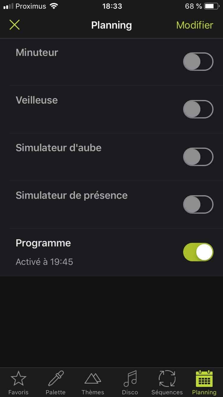 Mon article n’ayant pas pour but d’être le mode d’emploi de l’Awox Smart Light je vous ferai fî des détails concernant les options de l’appli. Malgré tout je peux vous dire que celle-ci est assez complète et vous permet de programmer des heures, des timers, des favoris de couleurs et quelques autres options assez sympa.