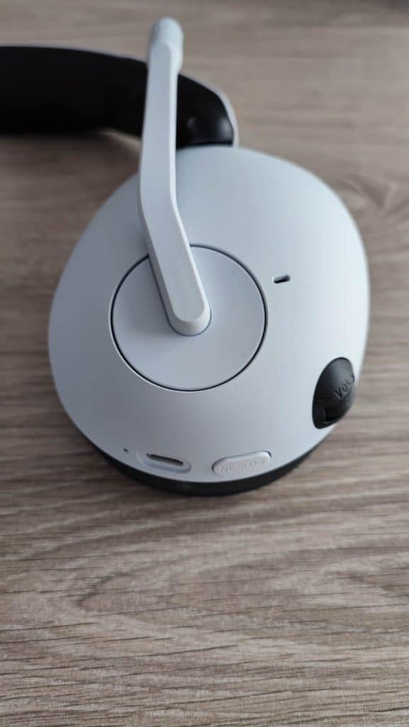 Chaque côté du casque Sony Inzone H9 offre son lot de boutons de fonction bien pratiques. Sur la droite, le bouton power, celui pour la connexion Bluetooth mais aussi celui pour régler l’équilibre son du chat/son du jeu. Sur la gauche, on retrouve une mollette pour le réglage du volume, un bouton pour activer/désactiver le mode annulation de bruit ou le son ambiant et l’entrée USB-C pour pouvoir recharger le casque. C’est également sur la gauche que se situe le micro, qui une fois déployé, active automatiquement la fonction micro.