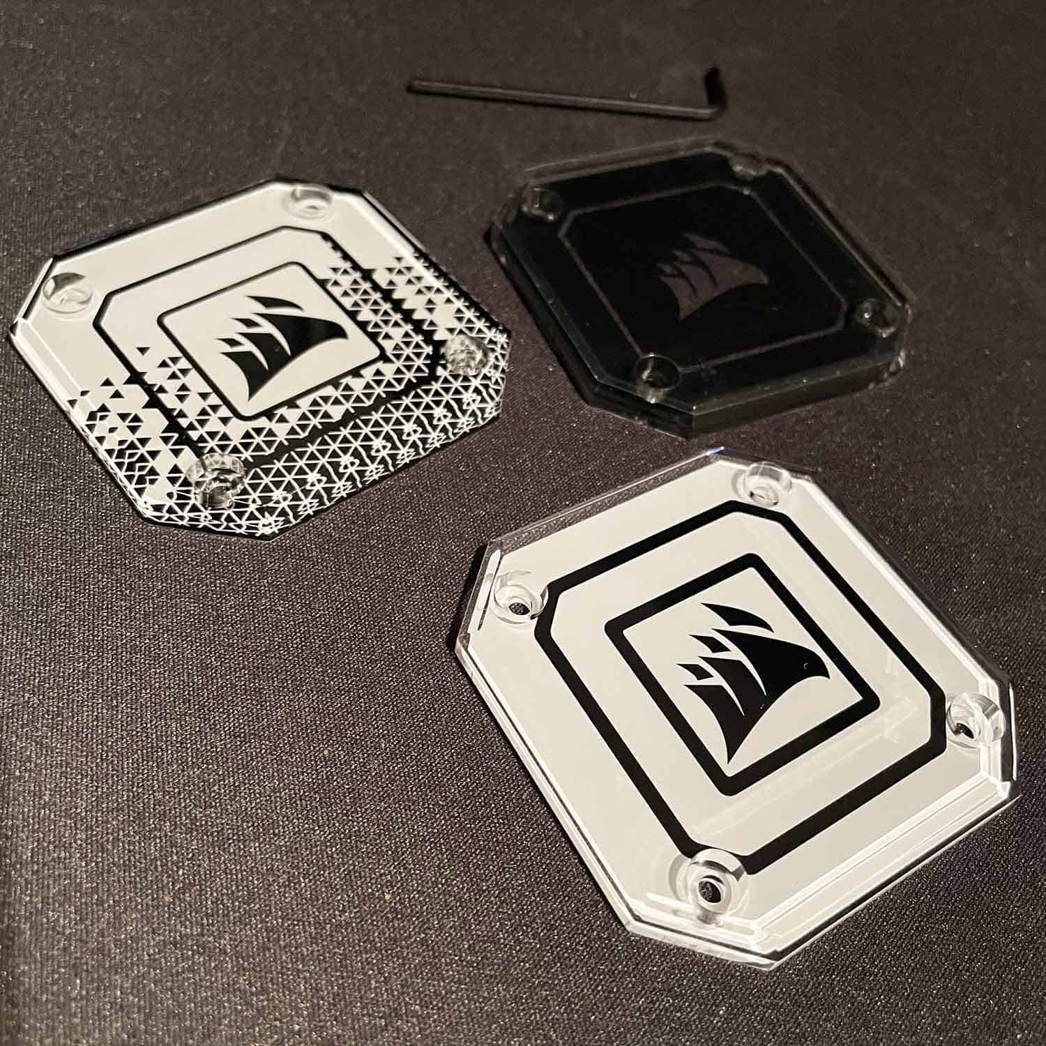 D’ailleurs, parlons brièvement plus en détails de ces ventilateurs qui sont des Corsair AF RGB Elite de 120 mm qui viennent se fixer sur un radiateur de 360 mm. Ces derniers offrent des vitesses de ventilation contrôlées par PWM pour un refroidissement puissant et un fonctionnement silencieux. Tout cela est possible grâce à des roulements à fluide dynamique, des ailettes anti-vortex et du lubrifiant qui réduisent considérablement la friction, tout en accroissant la durabilité du produit. De plus, ces fans s’avèrent également très esthétiques puisqu’ils sont tous munis de 8 LED RGB adressables individuellement comme seul Corsair en a le secret. Et en ce qui concerne la pompe, elle n’est pas en reste non plus puisqu’elle est équipée de 33 LED Capellix ultra-brillantes qui sont toutes adressables individuellement également, et entièrement paramétrables avec iCUE. À savoir que cette dernière est livrée avec trois caches interchangeables permettant de changer son design quand on le désire.