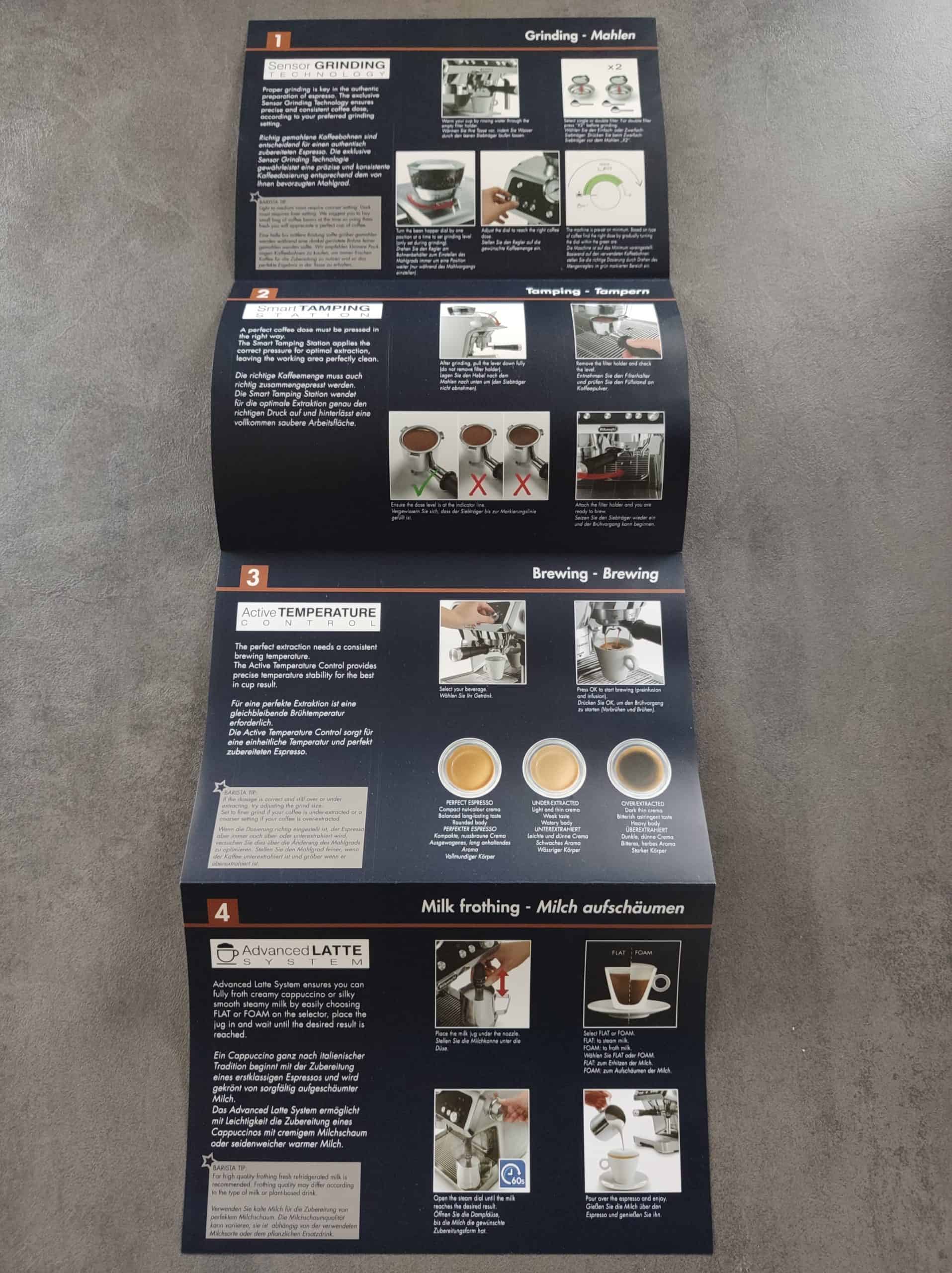 J’ai particulièrement apprécié le mode d’emploi rapide fourni avec la machine. Celui-ci couvre toutes les instructions de démarrage et l’utilisation des différents modes en images. Ce qui rend les choses tellement plus simples que de devoir lire des instructions purement écrites. Une fois tous les ustensiles installés, on peut maintenant commencer à utiliser la machine pour moudre le grain et réaliser notre premier espresso. J’ai opté pour des grains de café de grande distribution, mais sachez qu’il existe de nombreux magasins proposant une gamme venant directement des meilleurs torréfacteurs.