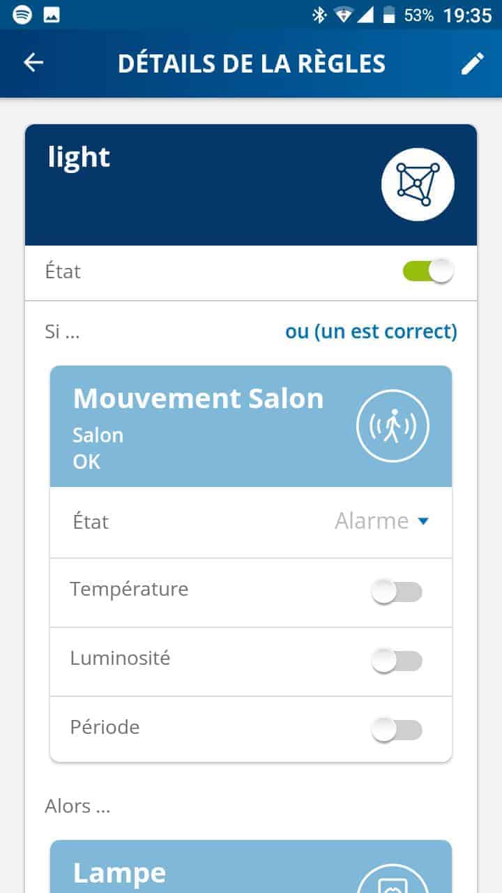 - En tant que règle : Si le capteur perçoit un mouvement > allumer une prise durant un certain laps de temps.